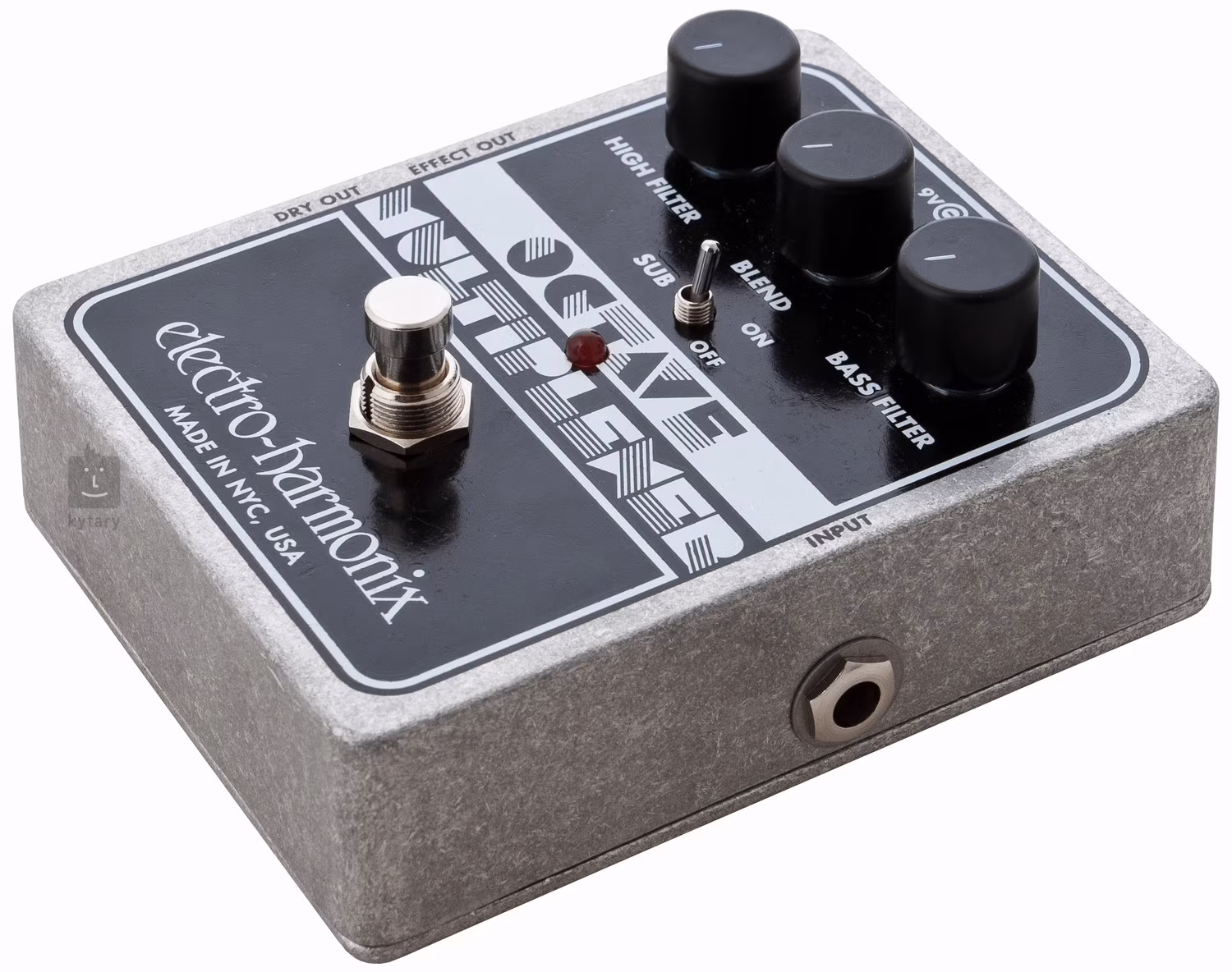 Účel této krabičky je asi zcela jasný – přidat jednu oktávu pod Váš signál, efekt je monofonický a optimálně funguje při hraní jednotlivých tónu, nedoporučuje se ho používat při akordovém hraní. A proč to dělat složité, když to jde jednoduše – pro ovládání tohoto efektu stačí jen tři potenciometry. High Filter ovlivňuje hlasitost vyšších harmonických tónu přidaného tónu, Bass Filter naopak hlasitost nižších alikvót a je aktivován pouze při sepnutí Sub Octave spínače, Blend určuje hlasitostní poměr mezi čistým signálem a přidanou oktávou.