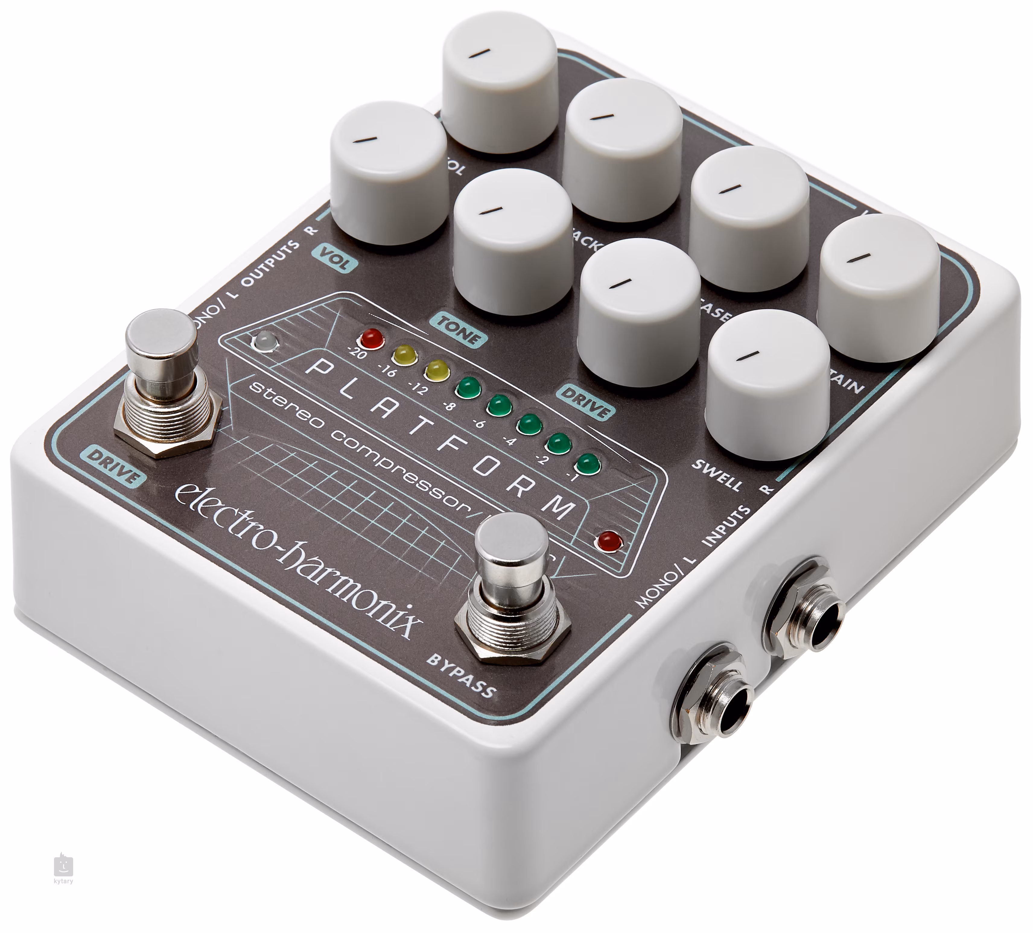 Funkce kompresoru/limitéru lze ovládat pomocí ovladačů Volume, Attack, Release, Sustain a tlačítek Limiter/Knee, které ovlivňují širokou škálu zvukových vlastností v podobě rychlosti a charakteru ataku nebo délky sustainu. Potenciometrem Swell zcela eliminujete zvukový atak; jeho otáčením docílíte různých fade in/reverse tónů s charakterem blízkým smyčcovým nástrojům nebo slide kytaře. Samostatná sekce overdrive s nožním spínačem a ovladači Volume, Tone a Drive je volbou, kterou můžete a nemusíte využít. Komu je bližší řízný zvuk rockové kytary tuto funkci uvítá.
