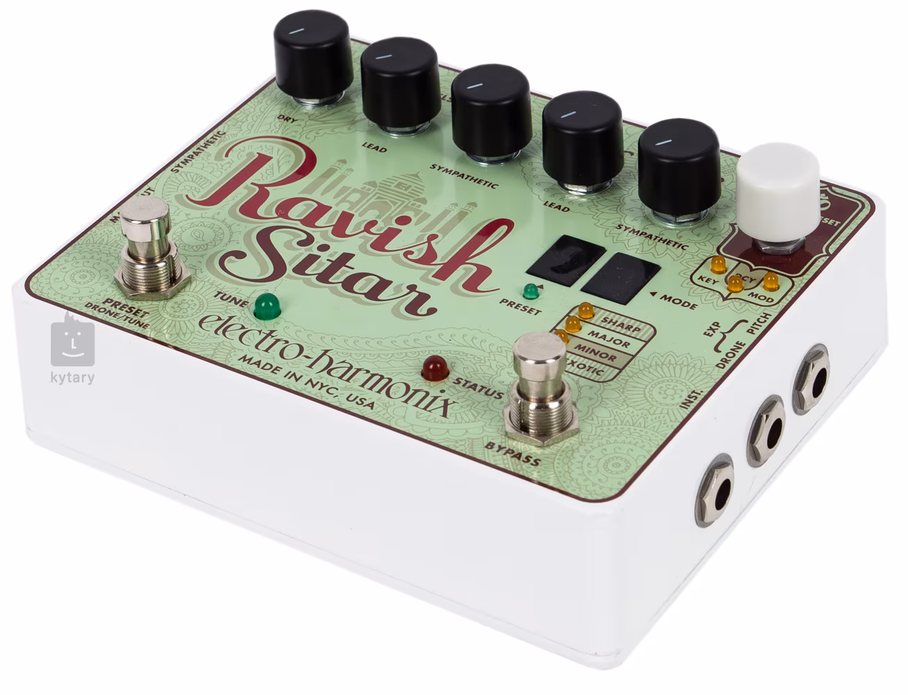 EHX Ravish Sitar je unikátní pedálový efekt, který změní zvuk elektrické kytary, baskytary a dalších nástrojů na sitár. Pokud patříte mezi fanoušky The Beatles, George Harrisona, Raviho Shankara (odtud vítr vane) a líbí se vám zvuk sitáru, ale necítíte potřebu si zrovna sitár pořizovat a učit se na něj, potom je Ravish Sitar šikovným a jednoduchým řešením problému.