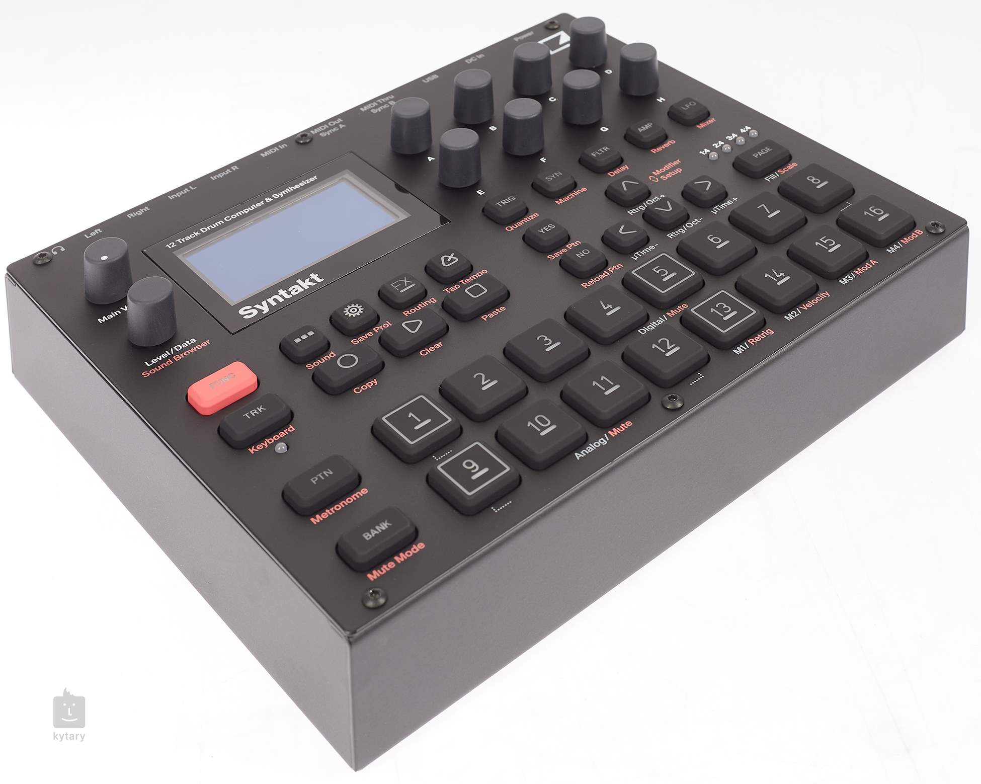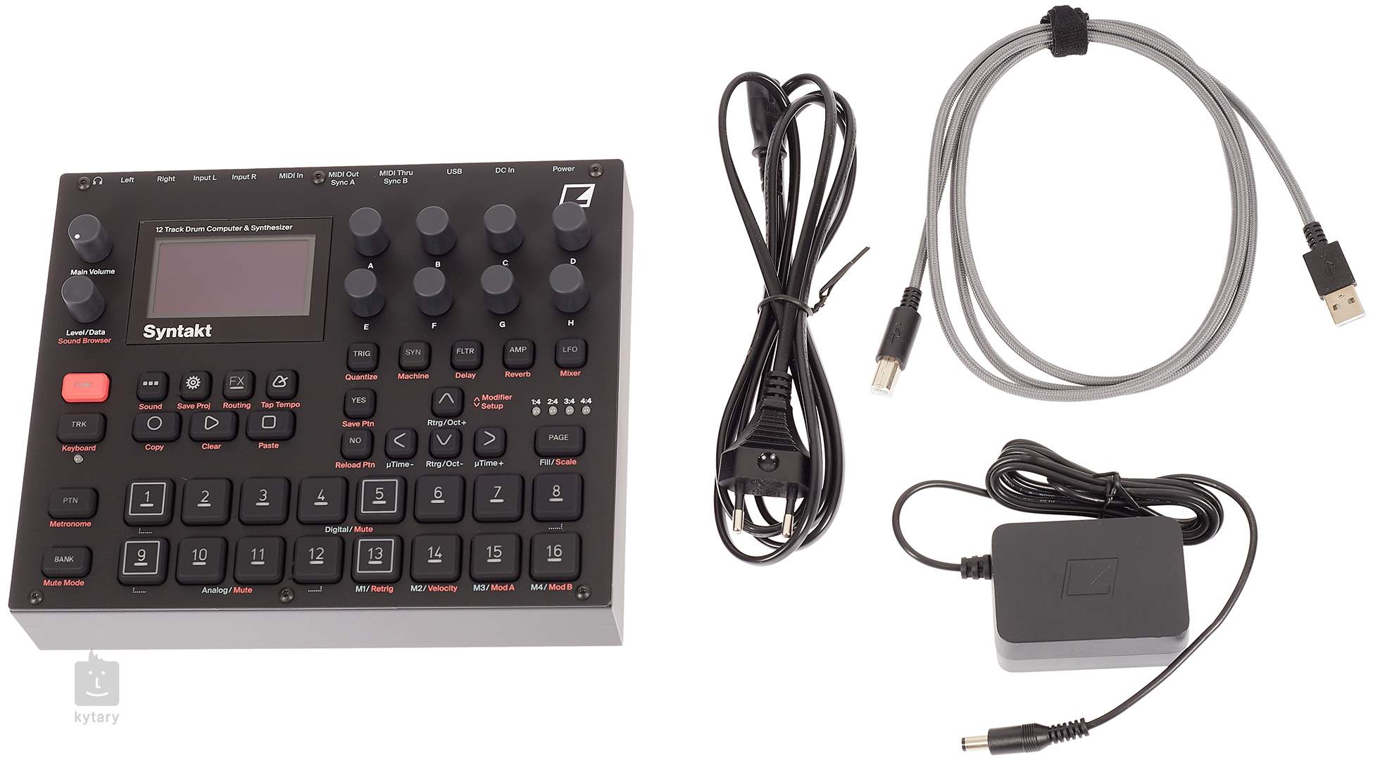 Maximální přehled nad produkcí potom získáte prostřednictvím grafického displeje a přehledného ovládacího panelu s barevným podsvícením. Samozřejmostí je podpora MIDI a sluchátkový výstup. K dispozici jsou efekty studiové kvality jako např.: Delay, Reverb, Distorion, filtry a přiřaditelné LFO pro každou audio stopu. Syntakt dále nabízí Keyboard mode, který posune vaší produkci na další level a samozřejmě oblíbený 64 krokový sekvencér světové kvality pro větší dynamiku vašich live performance a studiových session.