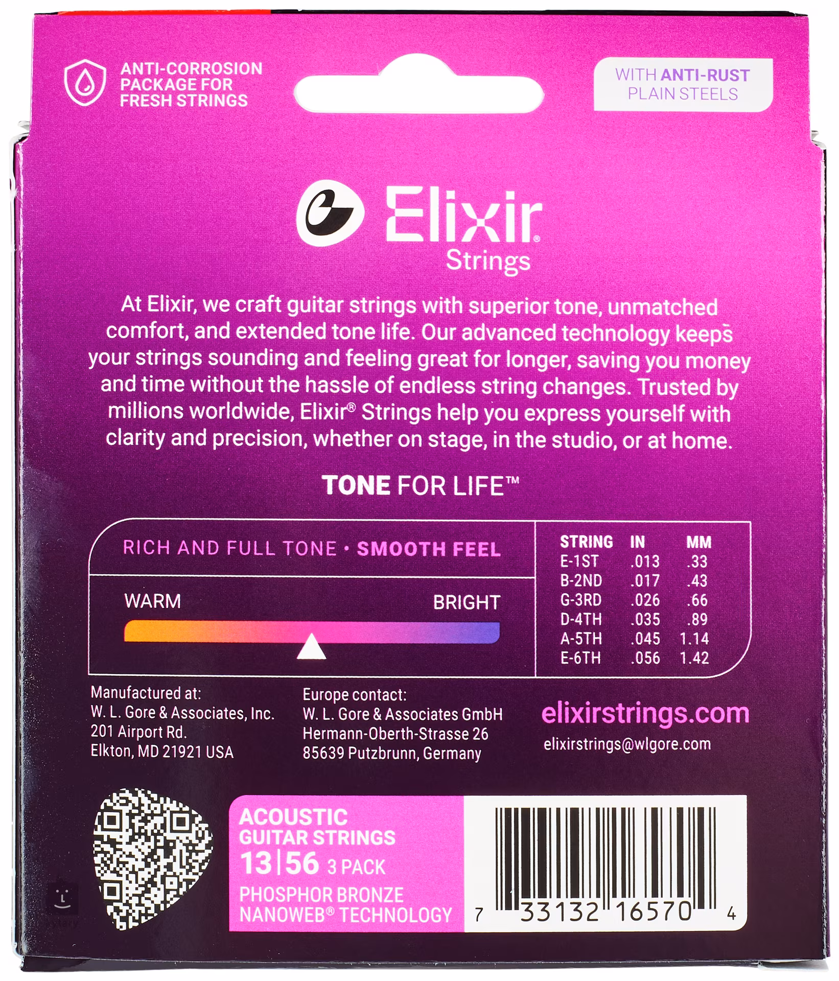 Struny Elixir jsou proslulé svou extrémně dlouhou životností, jíž je velmi těžké konkurovat. Díky speciálnímu potahu jsou odolné proti korozi, vlhkosti, nečistotám a potu, takže si dlouho zachovávají jasný a průrazný tón. Po zvukové stránce se jedná o velmi silné, zvonivé a rezonující struny, které prorazí na jakémkoliv pódiu či nahrávce. Struny s označením Phosphor Bronze mají vinutí vyrobené z fosforového bronzu, který jim dodává trochu vřelosti a barvy – výsledkem je frekvenčně vyvážený tón, v němž dostávají prostor basy i výšky.