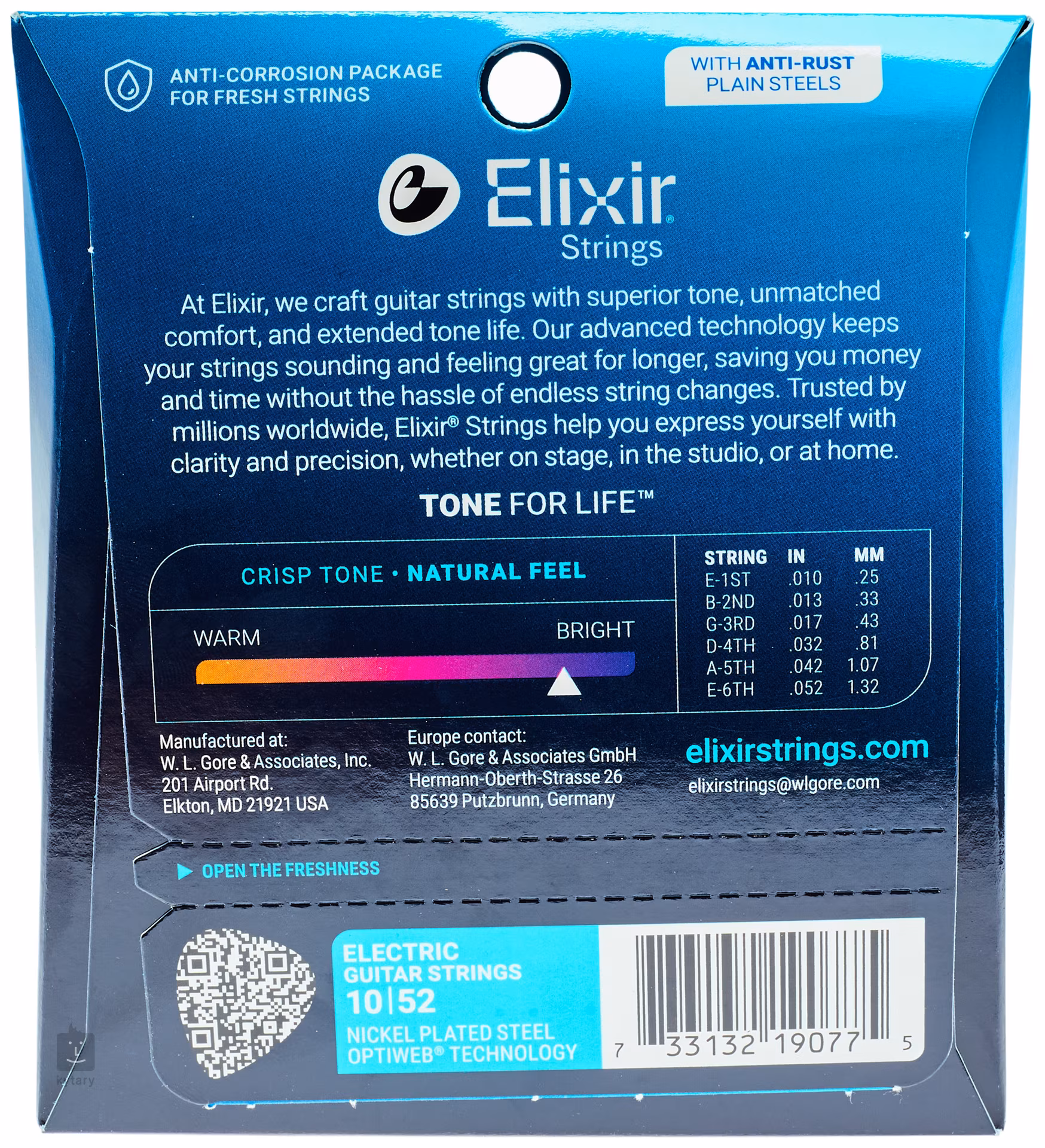 Struny Elixir jsou proslulé svou extrémně dlouhou životností, jíž je velmi těžké konkurovat. Díky speciálnímu potahu jsou odolné proti korozi, vlhkosti, nečistotám a potu, takže si dlouho zachovávají jasný a průrazný tón. Po zvukové stránce se jedná o velmi silné struny z poniklované oceli, které mají pořádný říz a charakter. Tato sada je potažena nejnovější ochrannou vrstvou z dílny Elixir zvanou Optiweb, která je tak tenká, že je od nepotahovaných strun naprosto nerozeznatelná. Je tedy ideální pro všechny, kteří chtějí těžit z výhod potahovaných strun, ale zároveň nechtějí dělat zvukové kompromisy.