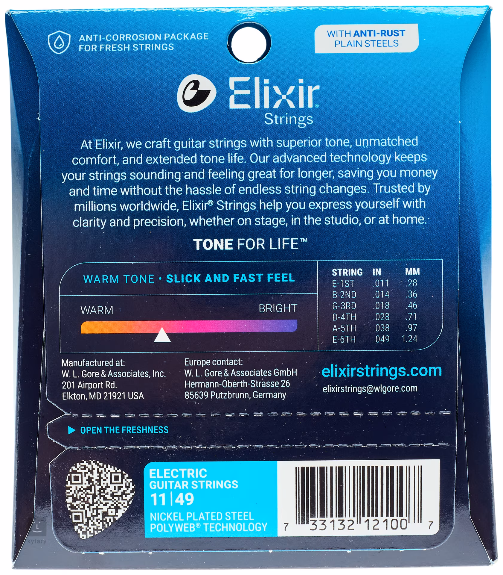 Struny Elixir jsou proslulé svou extrémně dlouhou životností, jíž je velmi těžké konkurovat. Díky speciálnímu potahu jsou odolné proti korozi, vlhkosti, nečistotám a potu, takže si dlouho zachovávají jasný a průrazný tón. Po zvukové stránce se jedná o velmi silné struny z poniklované oceli, které mají pořádný říz a charakter. Tato sada je potažena ochrannou vrstvou Polyweb, díky níž jsou struny extrémně odolné a hladší než běžné struny. Zároveň jemně tlumí cinkavost strun a tím jim dodávají tlumenější a vřelejší tón, ideální pro hráče, kteří preferují kulatější zvuk.