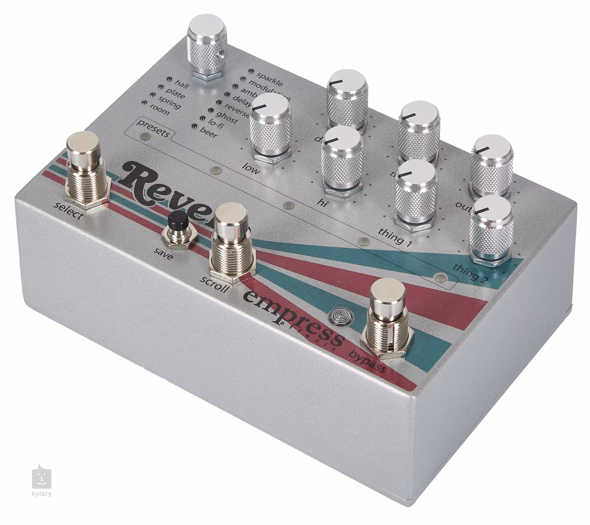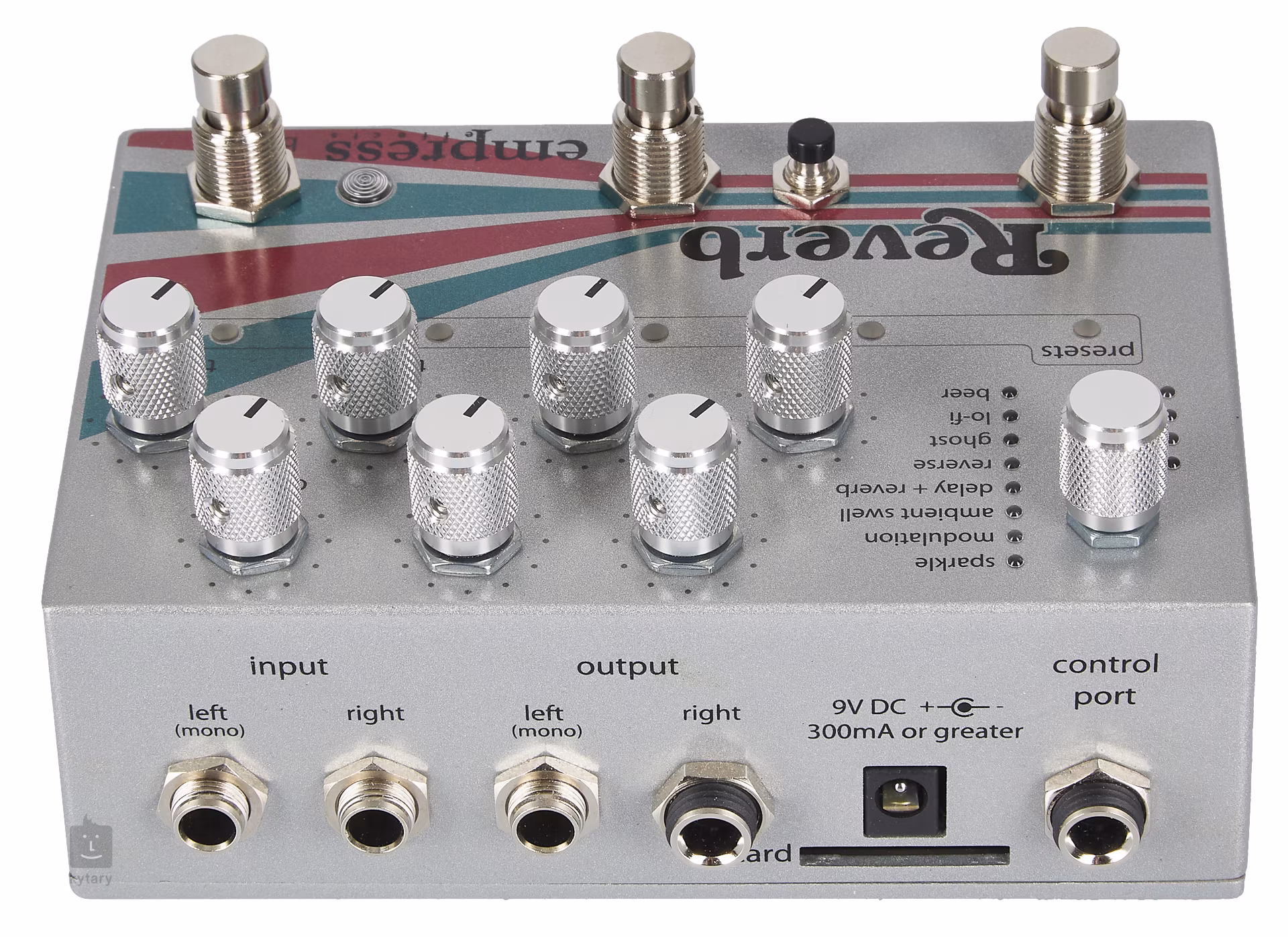 Empress Reverb kanadské značky Empress Effects je v podstatě takový malý, leč výkonný, multiefekt, který vám umožní vytvářet nekonečné množství působivých ploch a podmanivých zvuků na bázi efektu reverb. Ve dvanácti skupinách/algoritmech nabízí celkem 32 efektů reverb ve studiové kvalitě – od klasických podob hall, plate, spring a room reverbu po širokou škálu ambientních zvuků obohacených efektovou modulací včetně nezařaditelných efektů, pro které vývojáři vymysleli krásnou podskupinu Beer. Počet zvuků můžete navíc rozšířit stažením firmwarových updatů na SD kartu.