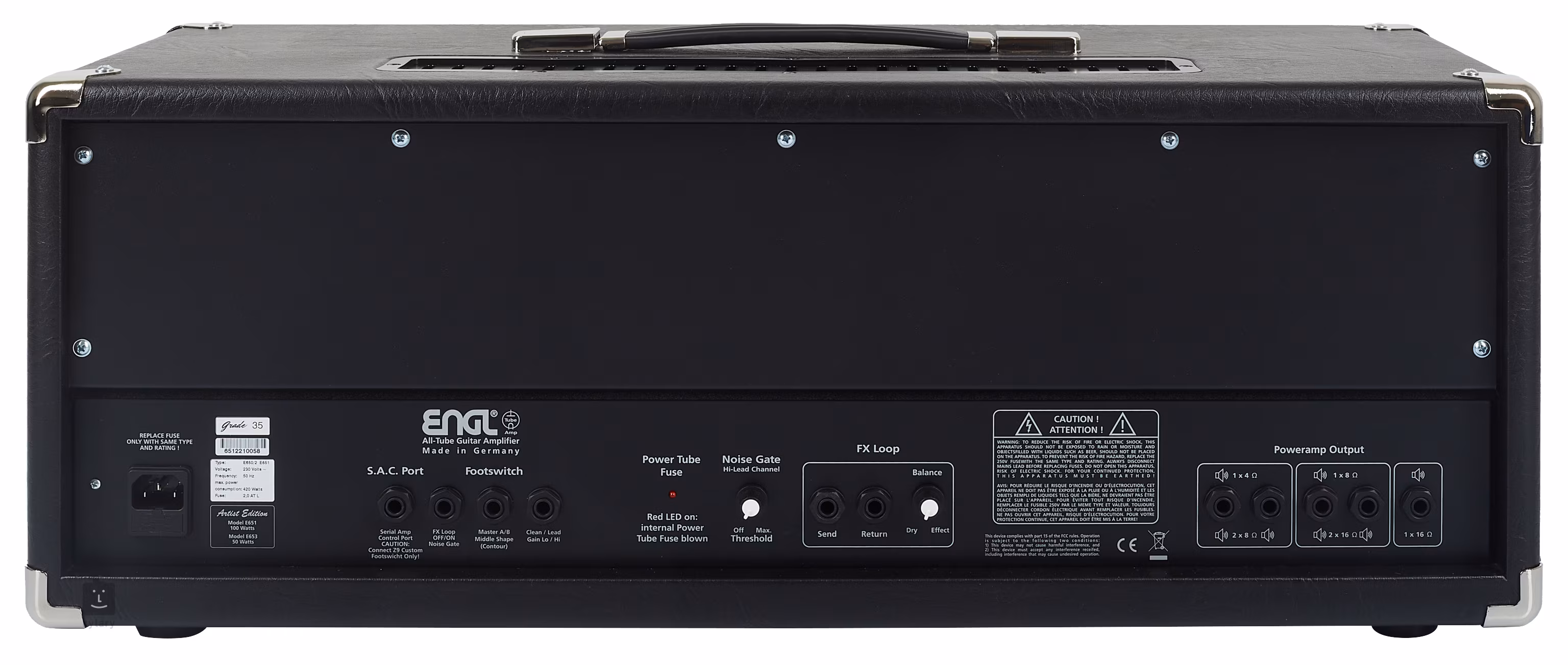 Přední strana zesilovače je designovaná přesně v duchu Engl. Klasická robustní mříž s logem a za ní svítí nažhavené lampy. Ovládání je vcelku minimalistické. Za vstupem pro kytaru je potenciometr čistého kanálu a tlačítko Bright. Dále následuje ovladač Lead, 3pásmový ekvalizér, přepínač Hi/Low Gain, tlačítko Shape a potenciometry Presence a Volume. Úplně na konci jsou dva Master ovladače pro čistý a zkreslený kanál. Výkon zesilovače odpovídá rovným 100 W. Starají se o něj 4 elektronky ECC83 v předzesilovači a 4 lampy EL34 v koncovém zesilovači.