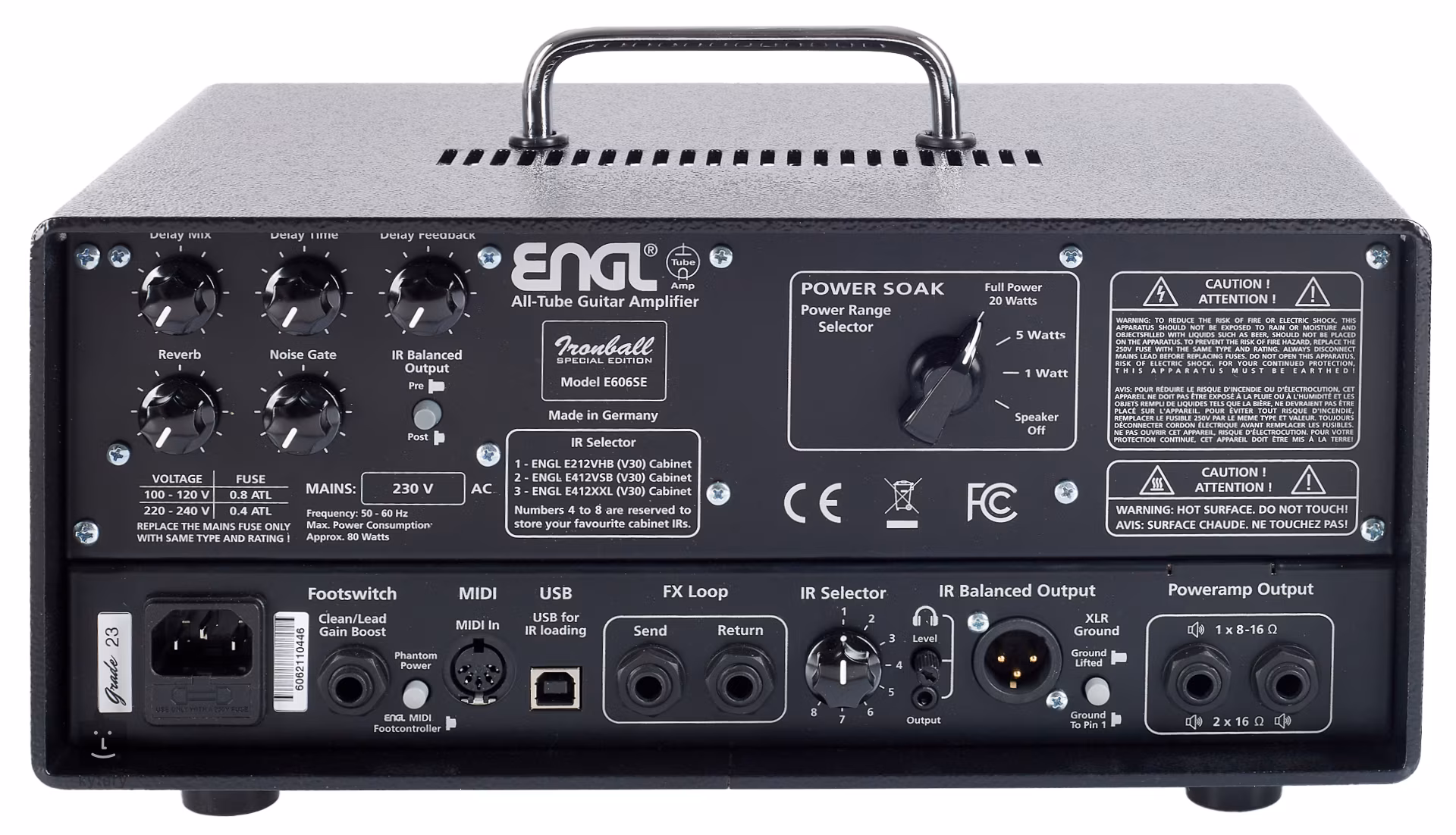 Digitální svět reprezentuje kompatibilita s MIDI, digitální efektový procesor (integrované efekty reverb a delay) a IR loader (zesilovač nabízí tři nastavené IR kabinetů Engl a pět slotů pro vaše vlastní IR, které nahrajete přes USB). Z toho je jasné, že kromě výstupů do reproboxů s impedancí 16 a 8 ohmů můžete využít i symetrický XLR DI výstup pro přímé propojení s mixpultem nebo nahrávacím zařízením. Zadní panel dále nabízí efektovou smyčku, vstup pro foostwitch a ovladače efektů (Reverb, Delay) a zabudovaného Noise Gate. Naprostá většina funkcí je ovladatelná přepínači na předním panelu případně pomocí MIDI foostwitchů.