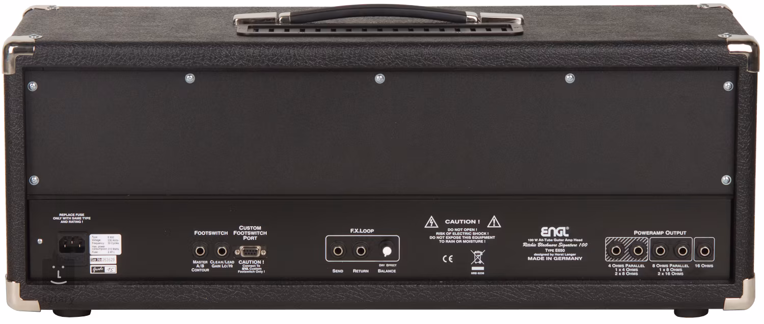 Na zadním panelu jsou další prvky. Jsou zde 2 duální a jeden speciální vstupy pro footswitche. Do duálních lze například zapojit 2 klasické footswitche (např. typ Z-3 nebo Z-4), nebo jeden MIDI nožní spínač s možností výstupu 6,3 jacky (např. Z-11). Do speciálního vstupu lze zapojit jen switch Engl Z-5. Vedle vstup, výstup a nastavení efektové smyčky. Poslední jsou výstupy na reproboxy. Lze sem zapojit 1x 4 Ohm, 2x 8 Ohm, 1x 8 Ohm, 2x 16 Ohm či 1x 16 Ohm.