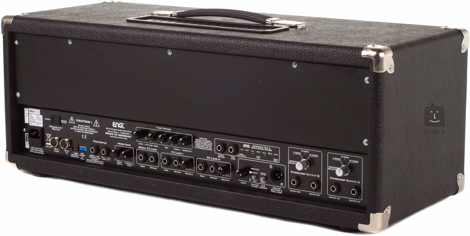 Zadní panel je obdobně zaplněn. V horní řadě nalezneme potenciometry Level, Bass, Middle, Treble a Sensitivity pro Tube Driver (aktivní pokud je zapojen v módu s ekvalizérem) a sekci nastavení BIASu. Dole jsou MIDI-in a –thru pro zapojení MIDI footswitche i se výstupem phantomového napájení pro Engl MIDI nožní spínače, poté je zde vstup pro Engl Z-9 a vstup pro duální footswitch (např. Z-3 nebo Z-4, ale lze jím pouze přepínat kanály). Další sekce se věnuje nastavení noise gate – lze u ní nastavit prahovou úroveň a taky to, od jaké úrovně signál vyloženě utlumí. Za ní se nachází vstupy a výstupy jedné sériové a dvou paralelních efektových smyček (u nich je samozřejmě možnost nastavení), linkový XLR výstup s nastavitelnou úrovní a nakonec A a B sekce výstupů pro reproboxy. Mezi těmito sekcemi se dá přepínat, to znamená, že můžete třeba použít různé sady reproboxů a měnit svůj zvuk pomocí nich. U každé sekce jsou 2 výstupy a lze volit mezi celkovou zátěží 4, 8 nebo 16 Ohm.