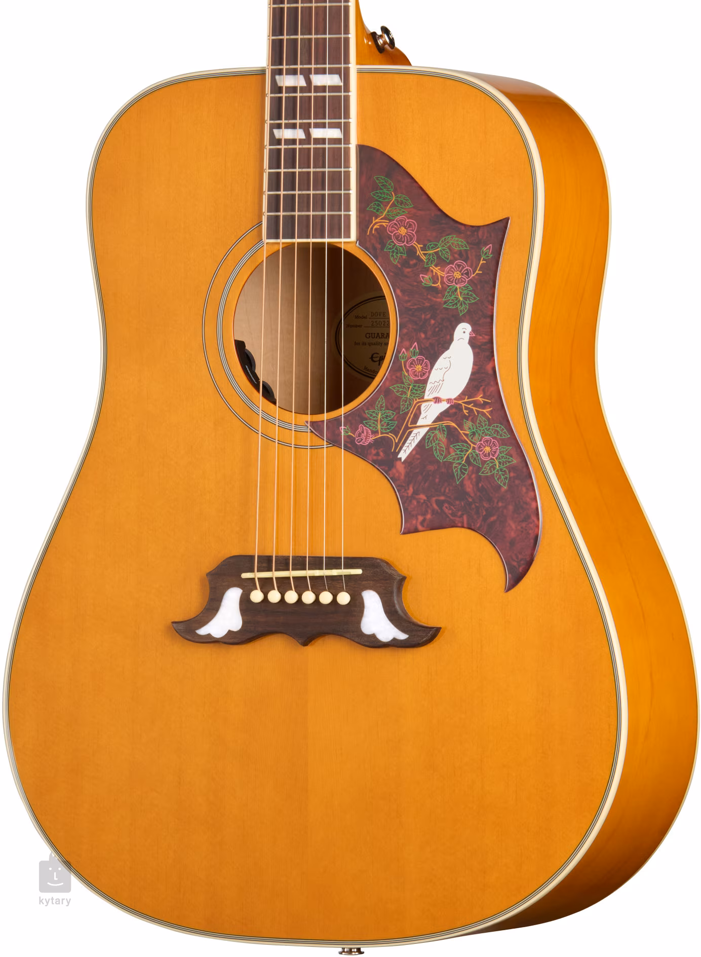 Elektroakustická kytara Epiphone Dove Studio Natural z řady Inspired by Gibson nabízí za dostupnější cenu vzhled a zvuk slavných long-scale square-shoulder Dreadnought modelů Gibson Dove.