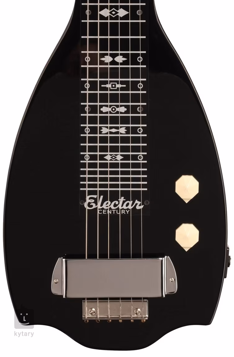 Tělo a krk lap steel kytary Electar Century 1939 Lap Steel Ebony jsou zhotoveny z mahagonu. Hmatník z plexiskla nabízí skvělé herní vlastnosti a krásně plynulý pohyb. Struny jsou uchyceny ve 3-in-line mechanikách s plastovými kolíčky a hliníkové kobylce kryté poniklovaným ocelovým krytem.