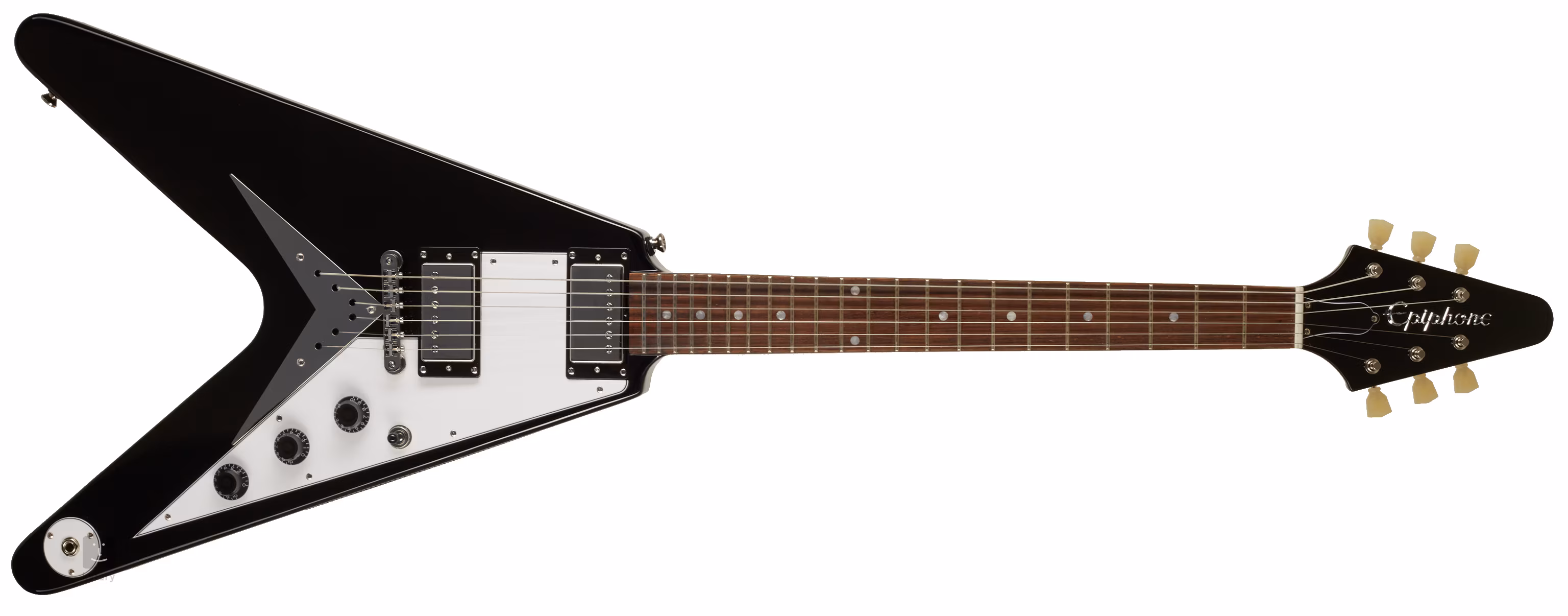 Elektrické kytary firmy Epiphone představují finančně dostupnější alternativu originálů s logem Gibson. Model Flying V Ebony ze série Inspired by Gibson se vrací k designu populárního „véčka“ z roku 1958.