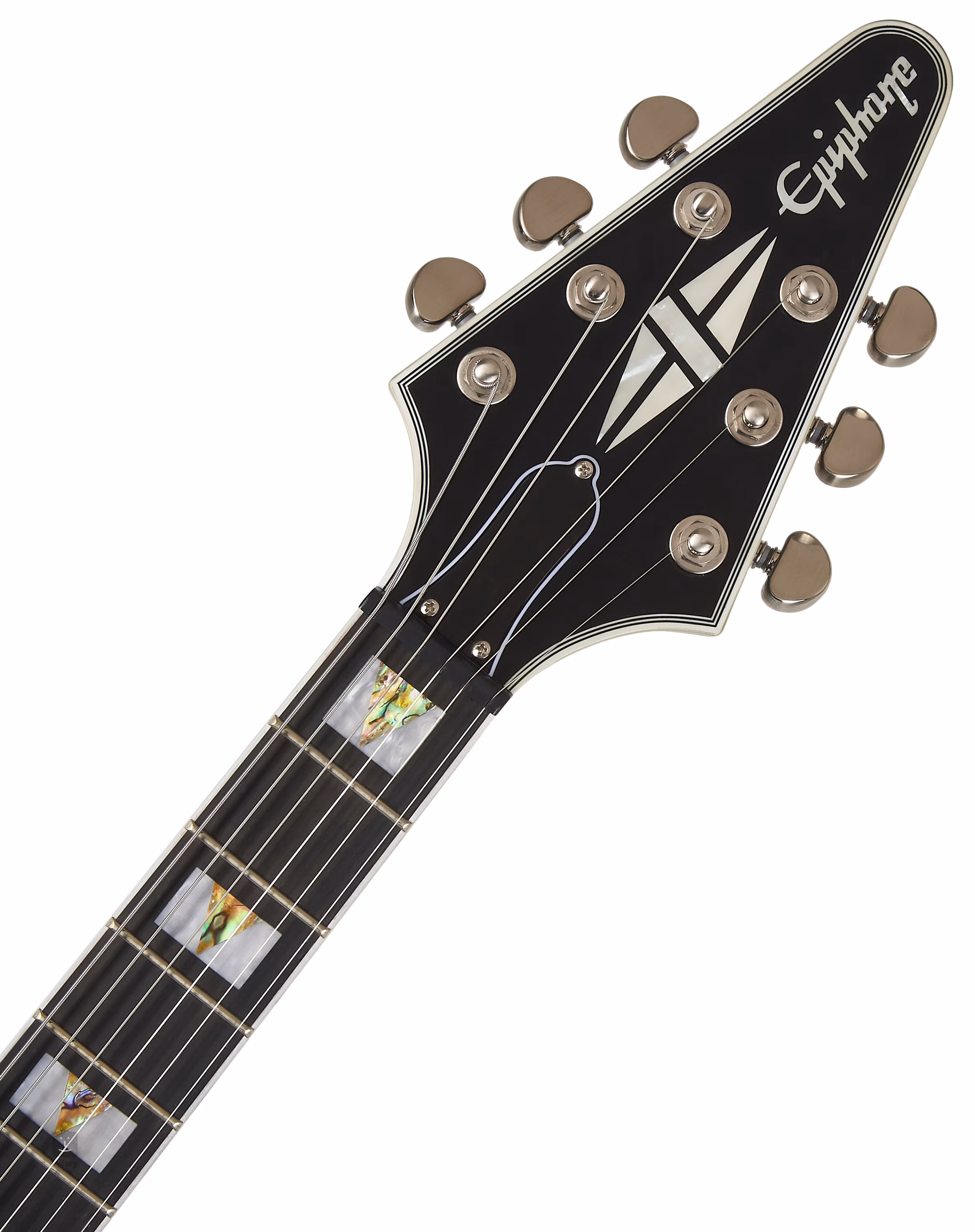 Mahagonové tělo „véčka“ Flying V Prophecy Yellow Tiger Aged Gloss zdobí efektní dýha z fládrovaného javoru kvality AAA. Asymetrický Slim Taper profil mahagonového krku poskytuje levé ruce potřebný komfort pro snadný a rychlý pohyb po celé ploše hmatníku. Samotný ebenový hmatník je osazen čtyřiadvaceti pražci velikosti Jumbo. Orientaci po ploše hmatníku usnadňují polohové bloky s vloženými kusy z pravé perleti (Abalone).