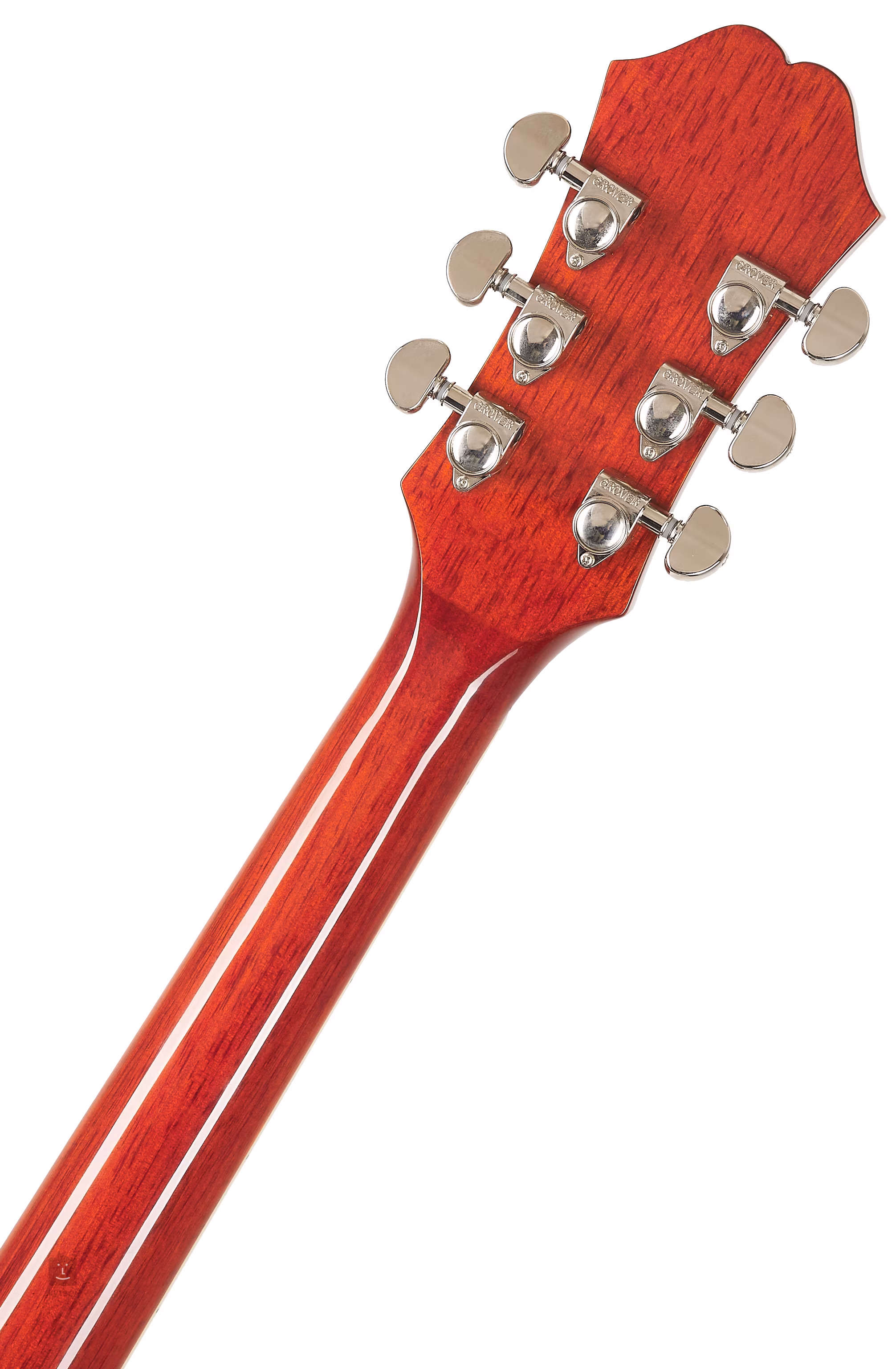 Struny jsou přes nultý pražec Graph Tech ukotveny v ladících mechanikách Grover Rotomatics s převodovým poměrem 18:1 a kobylce z pau ferro. Pěkné zpracování podtrhují detaily v podobě oboustranné lemovky těla z imitace slonoviny doplněné černými linkami, rozeta složená z černobílých prstenců a signifikantní prvky modelů Hummingbird v podobě zdobného pickguardu s povinným kolibříkem a barevné úpravy topu typu sunburst (Faded Cherry).