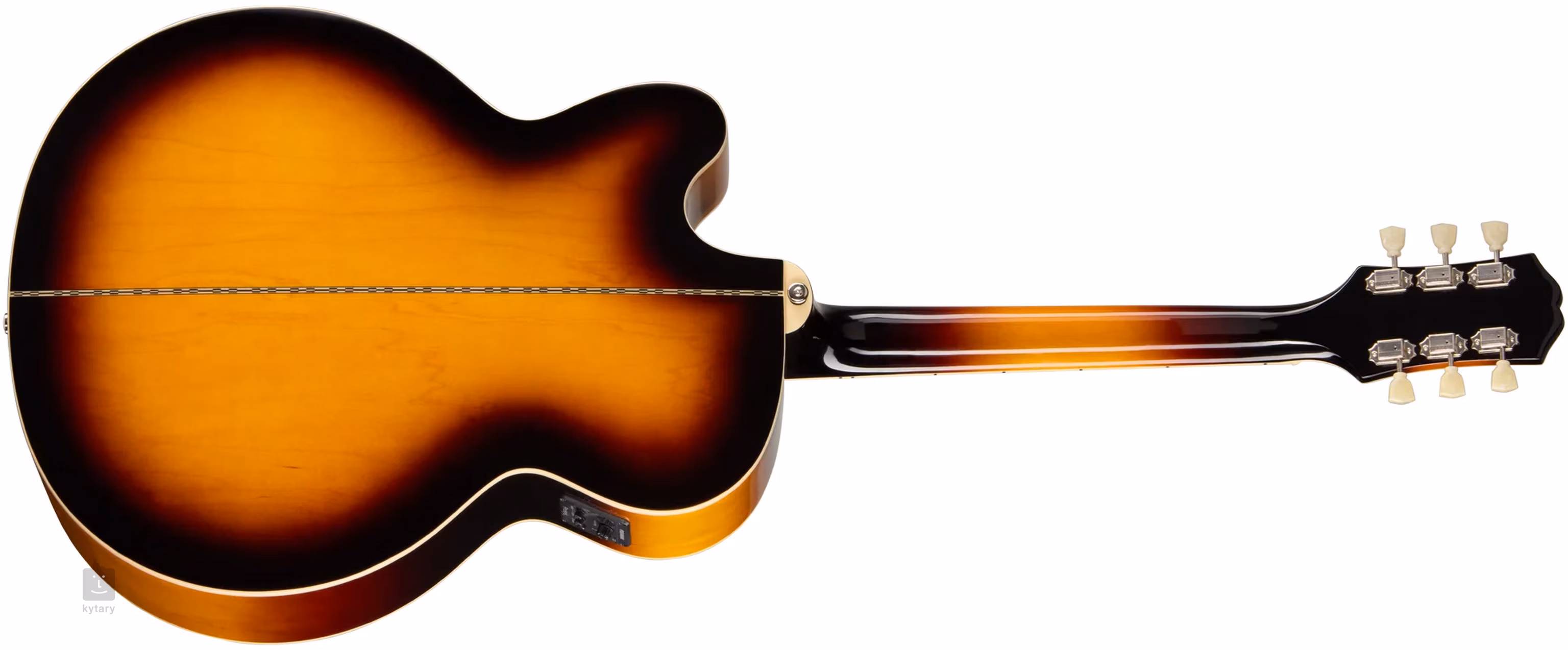 Elektroakustická kytara Epiphone J-200 Studio EC Vintage Sunburst z řady Epiphone Studio Acoustic Collection nabízí za dostupnější cenu vzhled a mohutný zvuk kytar Gibson Super Jumbo SJ-200.