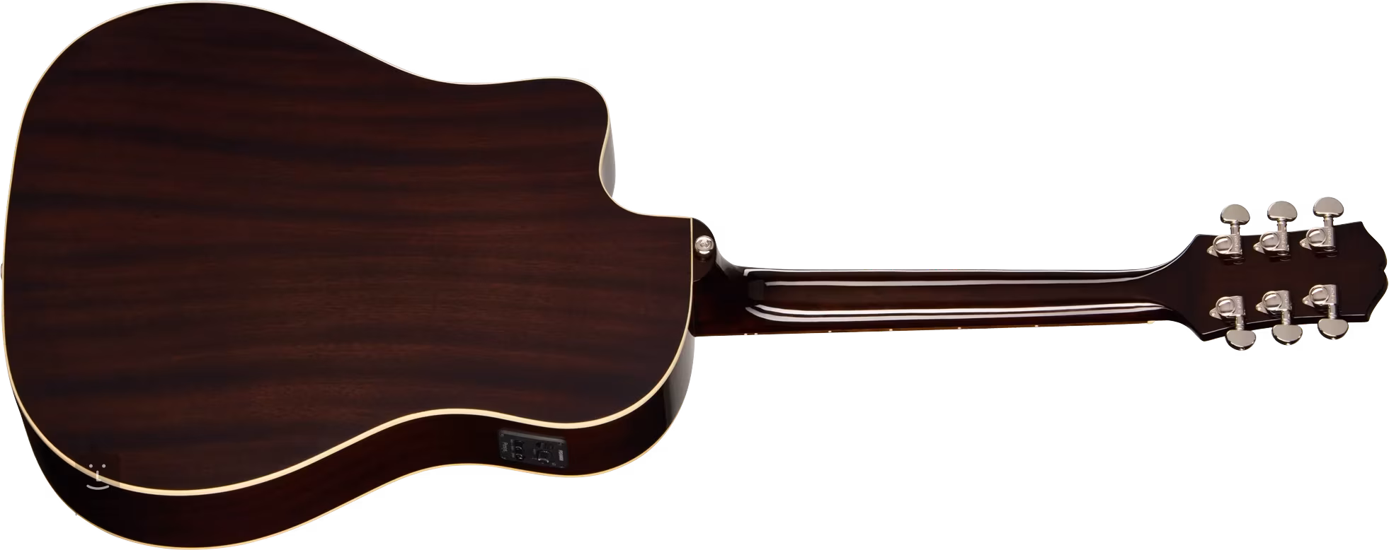 Přední deska elektroakustické kytary J-45 Studio EC Natural je zhotovena z masivu smrku, zadní deska a luby jsou vyrobeny z vrstveného mahagonu. K mahagonovému krku s pohodlným Rounded C profilem je přilepen palisandrový hmatník osazený dvaceti pražci. Dohmat na vyšších polohách hmatníku usnadňuje spodní výřez těla.