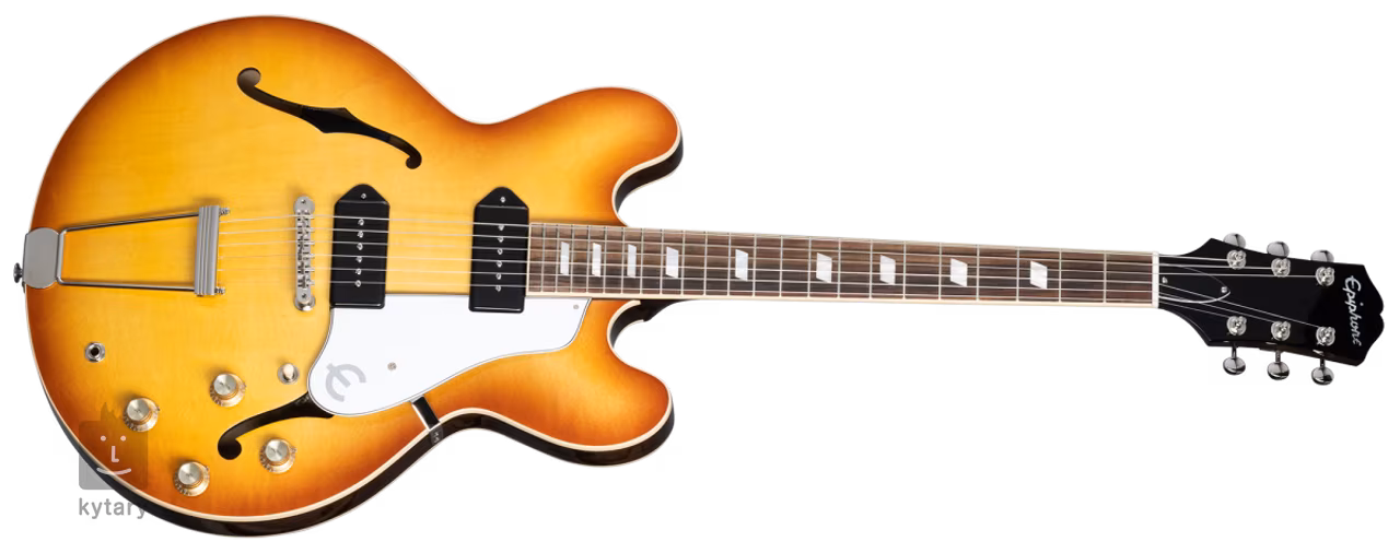 Struny jsou uchyceny v ladicích mechanikách Epiphone Vintage Deluxe a přes kobylku ABR-1 ve struníku (Thinline Trapeze). Pěkné zpracování podtrhuje lesklý lak z nitrocelulózy, obvodová lemovka těla, Epiphone Casino pickguard a niklový hardware.