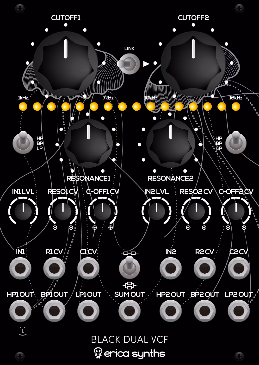 Black Dual VCF nabízí dvojici filtrů, každý s HP, BP, LP výstupem a resonancí a ořezem ovladatelnými pomocí CV. Filtry lze používat nezávisle, ve stereu nebo zapojené sériově a paralelně, což umožňuje vytváření pokročilých modulací. Jako bonus v modulu najdete šestnáctipásmový LED metr pro vizuální kontrolu signálu na summing výstupu.