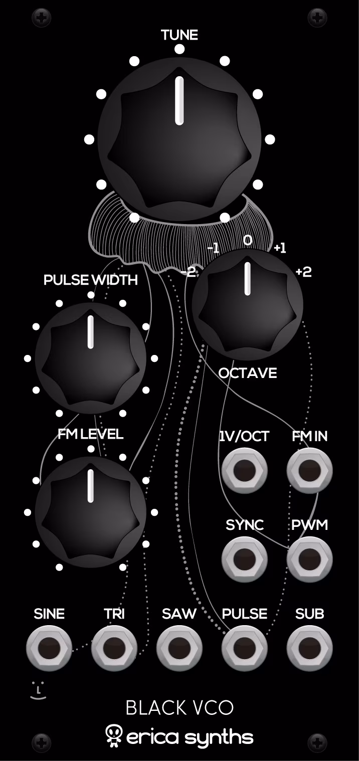 Black VCO je analogový oscilátor postavený na obvodu legendárního ruského syntezátoru Polivoks. Nabízí čtyři výstupy s různými vlnovými průběhy, které lze použít současně (sinus, pila, trojúhelník, puls) a tranzistorový suboscilátor se čtvercovým průběhem. Pulsní šířku lze nastavit jak manuálně, tak pomocí CV vstupu, nechybí exponenciální FM vstup s ovladačem úrovně. Přepínat lze mezi pěti oktávami, celkový rozsah je osm oktáv s velmi přesným laděním. Lze použít ve skiffu.
