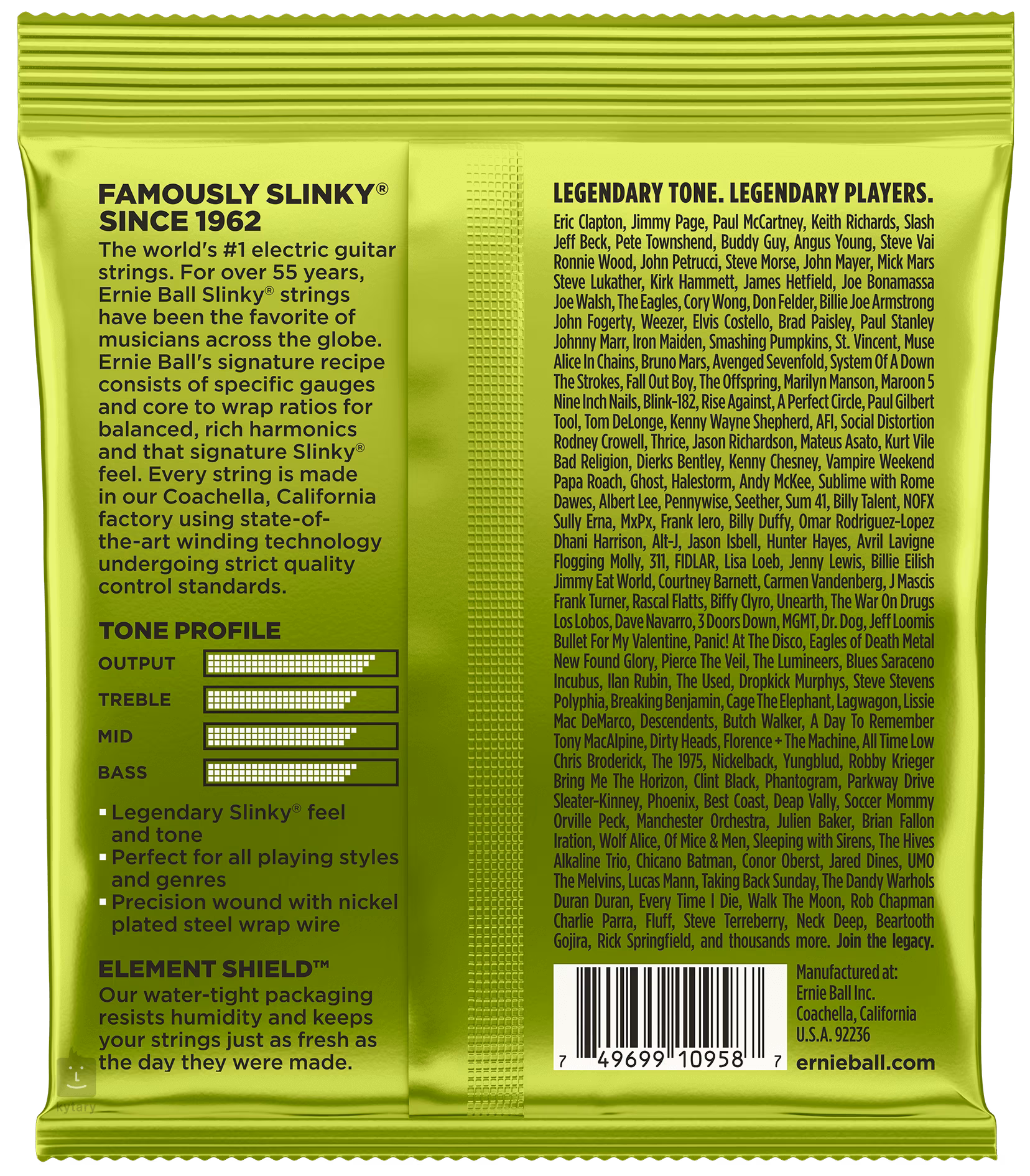 Struny Slinky Nickel Wound značky Ernie Ball jsou mezi strunami pro elektrické kytary naprostým bestsellerem a zlatým standardem. Vynikají zejména kvalitou použitých materiálů, precizním zpracováním a zvukovou všestranností, díky níž se uplatní v téměř jakémkoliv hudebním žánru. Jejich základem je šestihranné ocelové jádro a válcové vinutí z poniklované oceli. Výsledkem je frekvenčně vyvážený tón, který se uplatní v rockové, metalové, popové i bluesové hudbě.