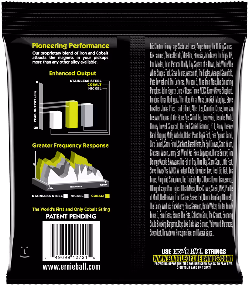 Struny pro elektrické kytary značky Ernie Ball z řady Cobalt Slinky byly vyvinuty tak, aby maximalizovaly hlasitost a čistotu zvuku, pročež využívají ty nejmodernější materiály a technologie výroby. Jsou typické velkým dynamickým rozsahem, velkým množstvím vyšších harmonických tónů, silnějšími basy a čistými, průraznými výškami. Jejich kouzlo spočívá ve využití kobaltu, který lépe pracuje s magnetickým polem snímačů a nabízí tak precizní snímání zvuku. Díky kobaltu jsou struny také měkčí a flexibilnější, což oceníte zejména při bendingu.