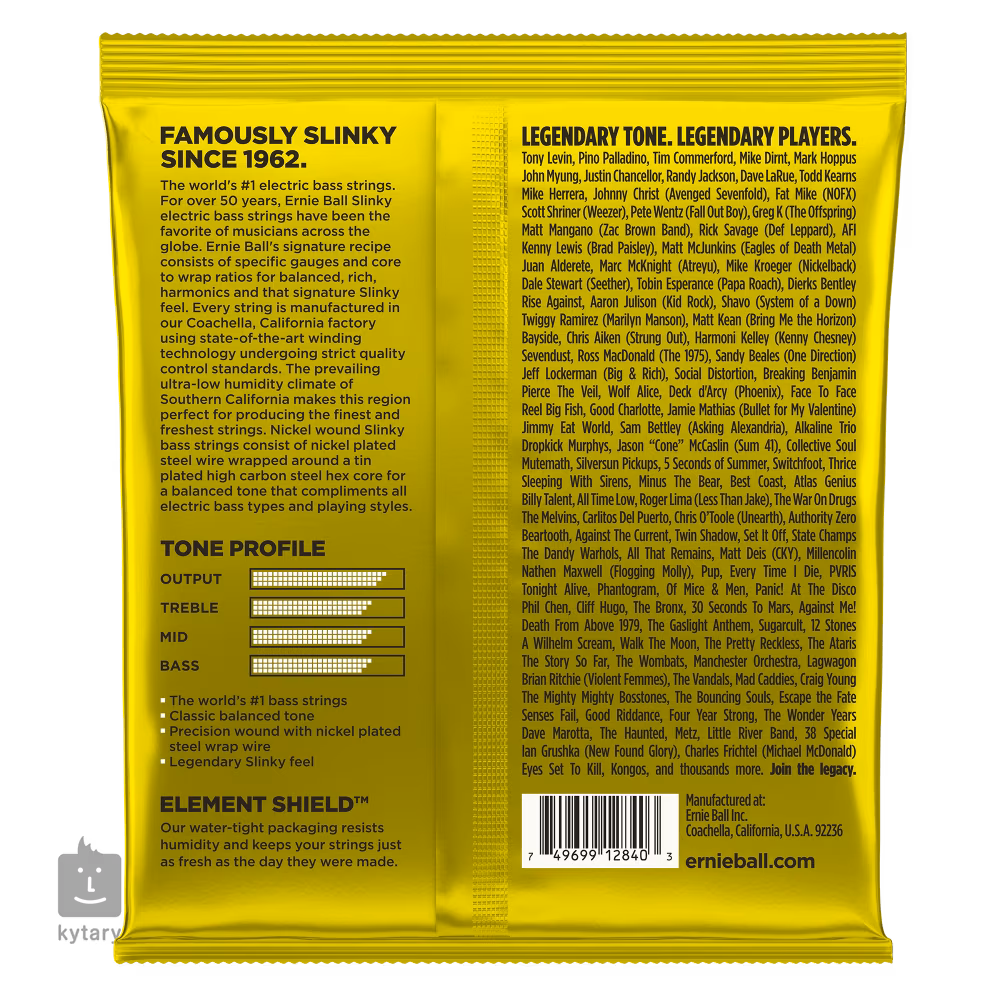 Americká firma Ernie Ball patří již řadu desetiletí mezi přední výrobce kytarových a baskytarových strun. Pro jejich výrobu používá ty nejmodernější technologie a kvalitní materiály. Reaguje tak na současné požadavky a nároky i těch nejnáročnějších muzikantů. Jejich unikátní zvuk je zachycen na nahrávkách osobností jako Paul McCartney, Tony Levin, Mark Hoppus, Mike Herrera, Johnny Christ, Dave La Rue, John Myung nebo Juan Alderete. Struny jsou vyráběny ve Spojených státech amerických.