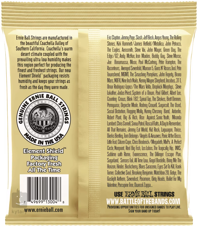 Americká firma Ernie Ball patří již řadu desetiletí mezi přední výrobce kytarových strun. Pro jejich výrobu používá ty nejmodernější technologie a kvalitní materiály. Reaguje tak na současné požadavky a nároky i těch nejnáročnějších kytaristů. Jejich unikátní zvuk je zachycen na nahrávkách osobností jako Paul McCartney, Keith Richards, Eric Clapton, Slash nebo Jimmy Page.