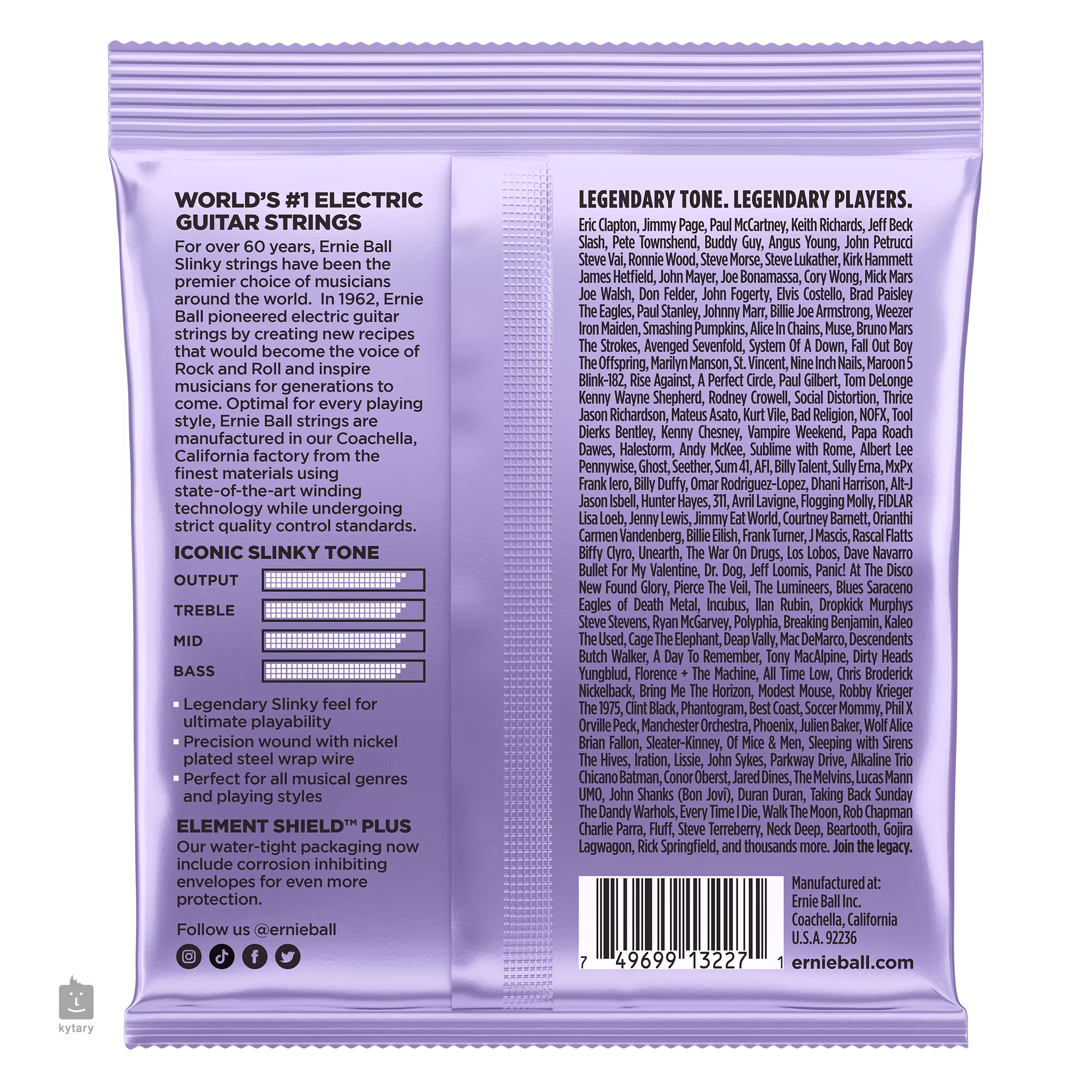 Tyto struny značky Ernie Ball jsou mezi strunami pro elektrické kytary naprostým bestsellerem a zlatým standardem. Vynikají zejména kvalitou použitých materiálů, precizním zpracováním a zvukovou všestranností, díky níž se uplatní v téměř jakémkoliv hudebním žánru. Jejich základem je šestihranné ocelové jádro a válcové vinutí z poniklované oceli. Výsledkem je frekvenčně vyvážený tón, který se uplatní v rockové, metalové, popové i bluesové hudbě.