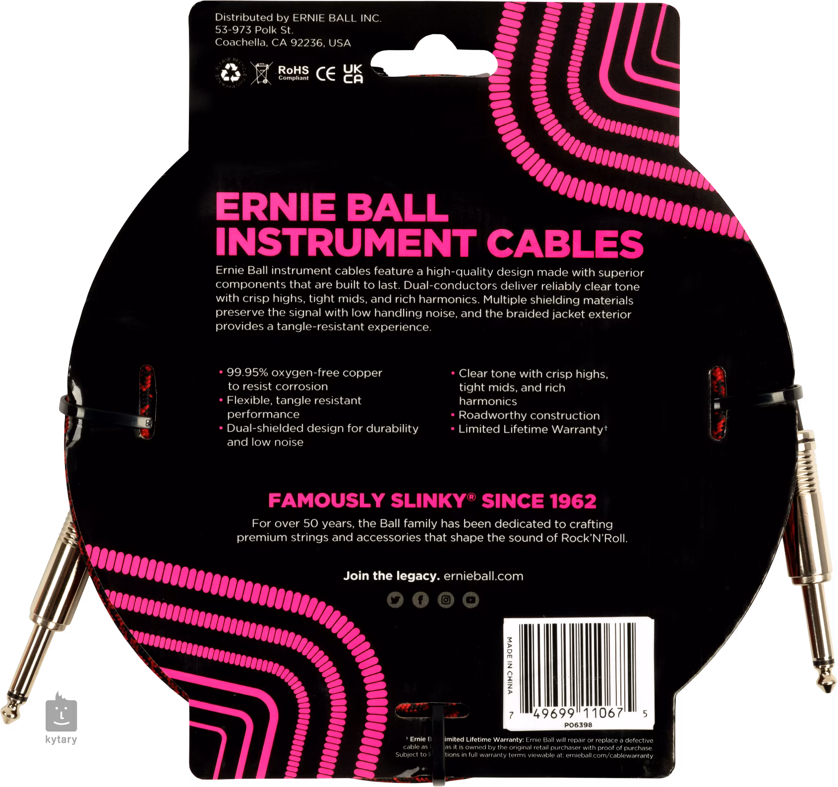 Při výrobě kabelů Ernie Ball byly použity ty nejkvalitnější komponenty k dosažení optimálního přenosu signálu a maximální životnosti. Dvojité vodiče se starají o věrnou reprodukci celého frekvenčního spektra a několikanásobné stínění udržuje signál bez nepříjemných ruchů a šumu. Vnější strana kabelu je opletena pro lepší ochranu, kabel se tedy nezamotává a odolá všem nástrahám na koncertech a ve zkušebnách.