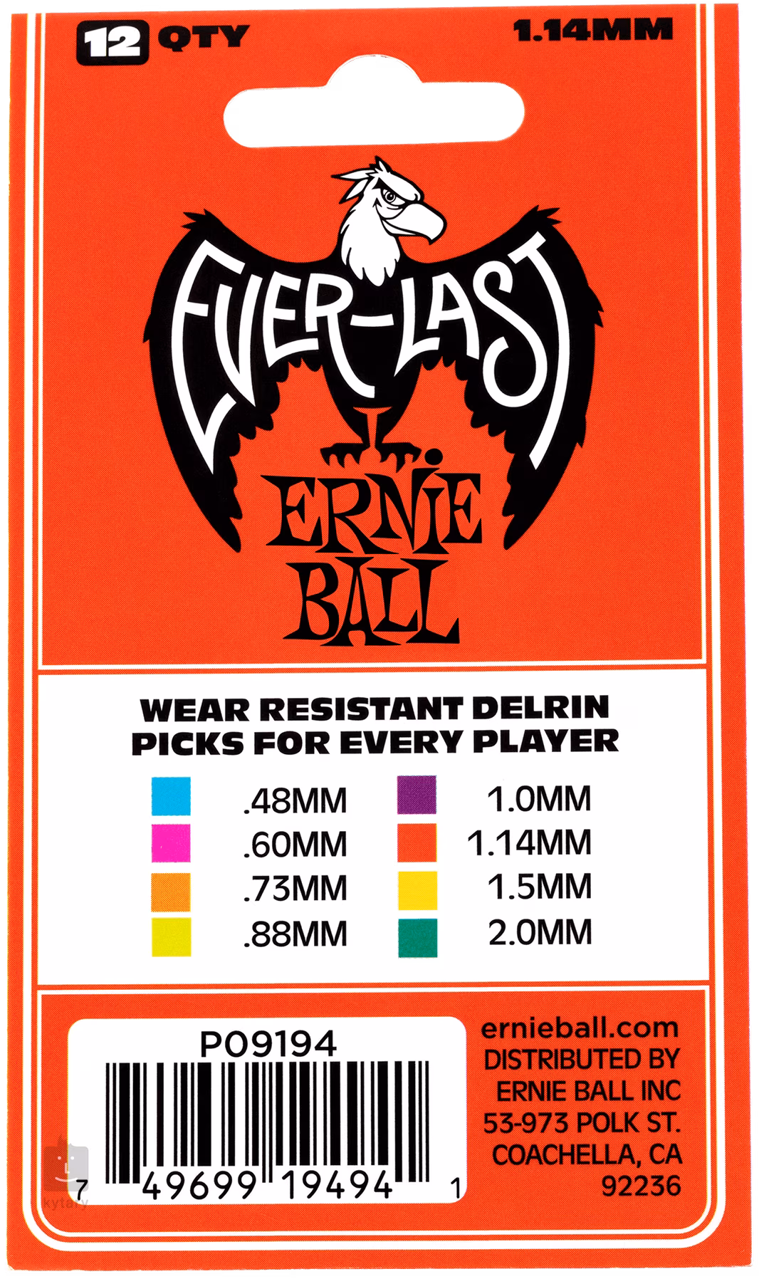 Řada trsátek Everlast značky Ernie Ball je vyrobena z materiálu delrin, který je díky výjimečné pevnosti, odolnosti, stabilitě a nízkému tření hojně používán v průmyslu – ze stejných důvodů je ideálním materiálem také na výrobu trsátek. Trsátko z delrinu vám zajistí jasný a vřelý tón s definovaným atakem. V sadě najdete 12 kusů.