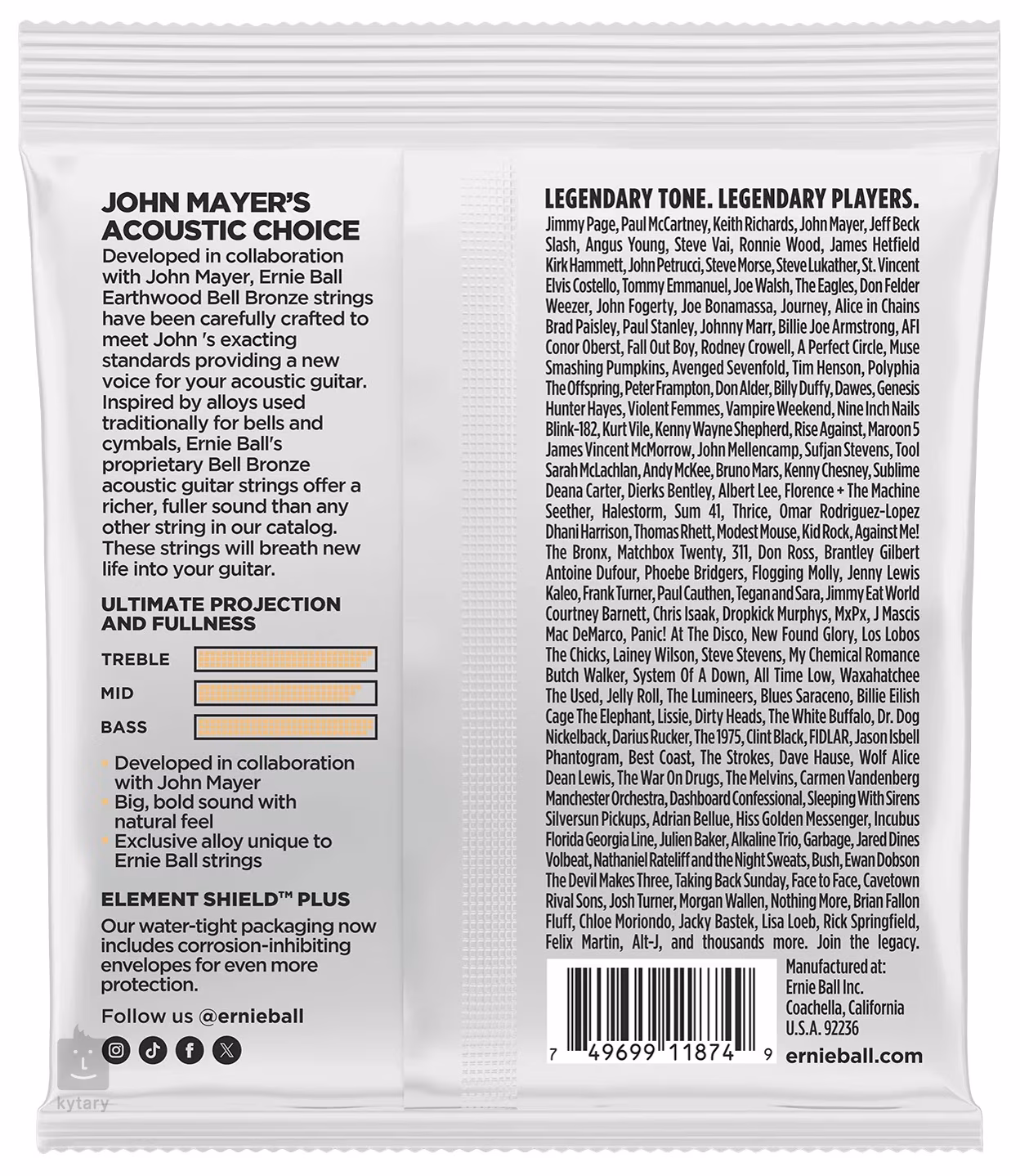 Struny pro akustickou kytaru Earthwood Bell Bronze jsou výsledkem dlouholeté spolupráce mezi společností Ernie Ball a kytaristou Johnem Mayerem, jehož unikátní styl hry ovlivnil celou generaci muzikantů. Tato sada byla vyladěna tak, aby splňovala Mayerovy náročné požadavky a využívá materiály, které u žádných jiných strun nenajdete. Struny jsou vinuté bronzovou slitinou, která se tradičně používá pro výrobu zvonů a činelů, což jim dodává jasný, rezonující tón, jenž vaší kytaře vdechne nový život. Dopřejte sobě a své kytaře to nejlepší se strunami Earthwood Bell Bronze.