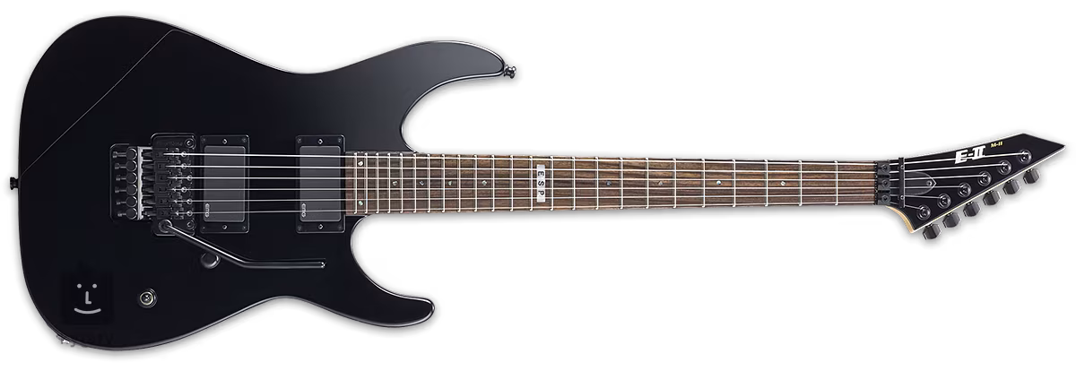 Kytary s moderním tvarem Super ST a označením M (Mirage) jednoduše identifikujete podle plochého topu těla a špičaté hlavice s mechanikami 6-in-line. Konstrukce kytary E-II M-II Neck Thru BLK je složena z olšových křídel a průchozího krku ze tří kusů javoru s užším U profilem. Plochu ebenového hmatníku rozděluje čtyřiadvacet pražců z nerezové oceli velikosti Extra Jumbo. Orientaci na hmatníku usnadňují perleťové poziční značky.