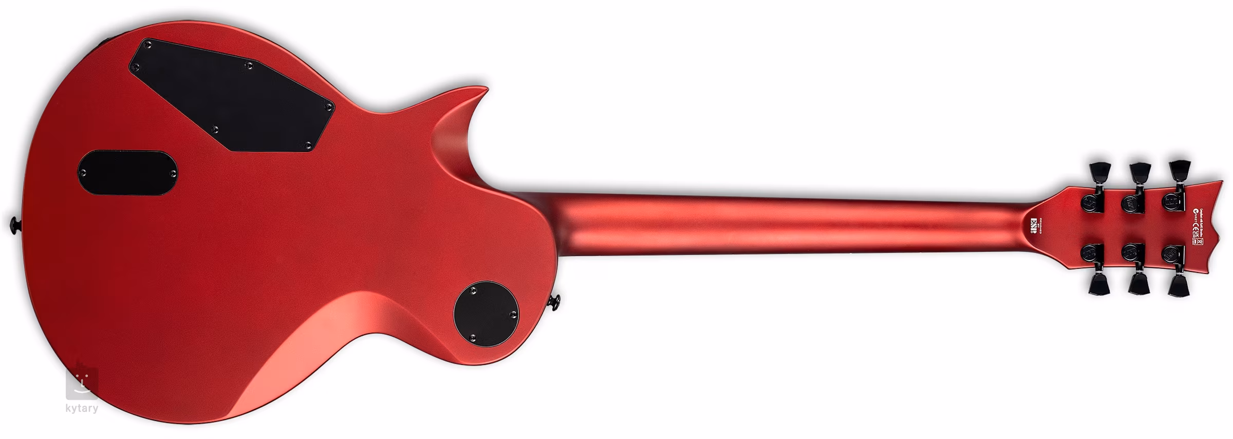 Mahagonové tělo kytary EC-1000 Candy Apple Red Satin zdobí matný finiš Apple Red Satin a vícevrstvá obvodová lemovka. Ke krku ze tří kusů mahagonu s konstrukcí set-thru, tj. krkem zapuštěným hlouběji do těla, je přilepen hmatník z ebenu makassar osazený čtyřiadvaceti pražci z nerezové oceli velikosti Extra Jumbo.