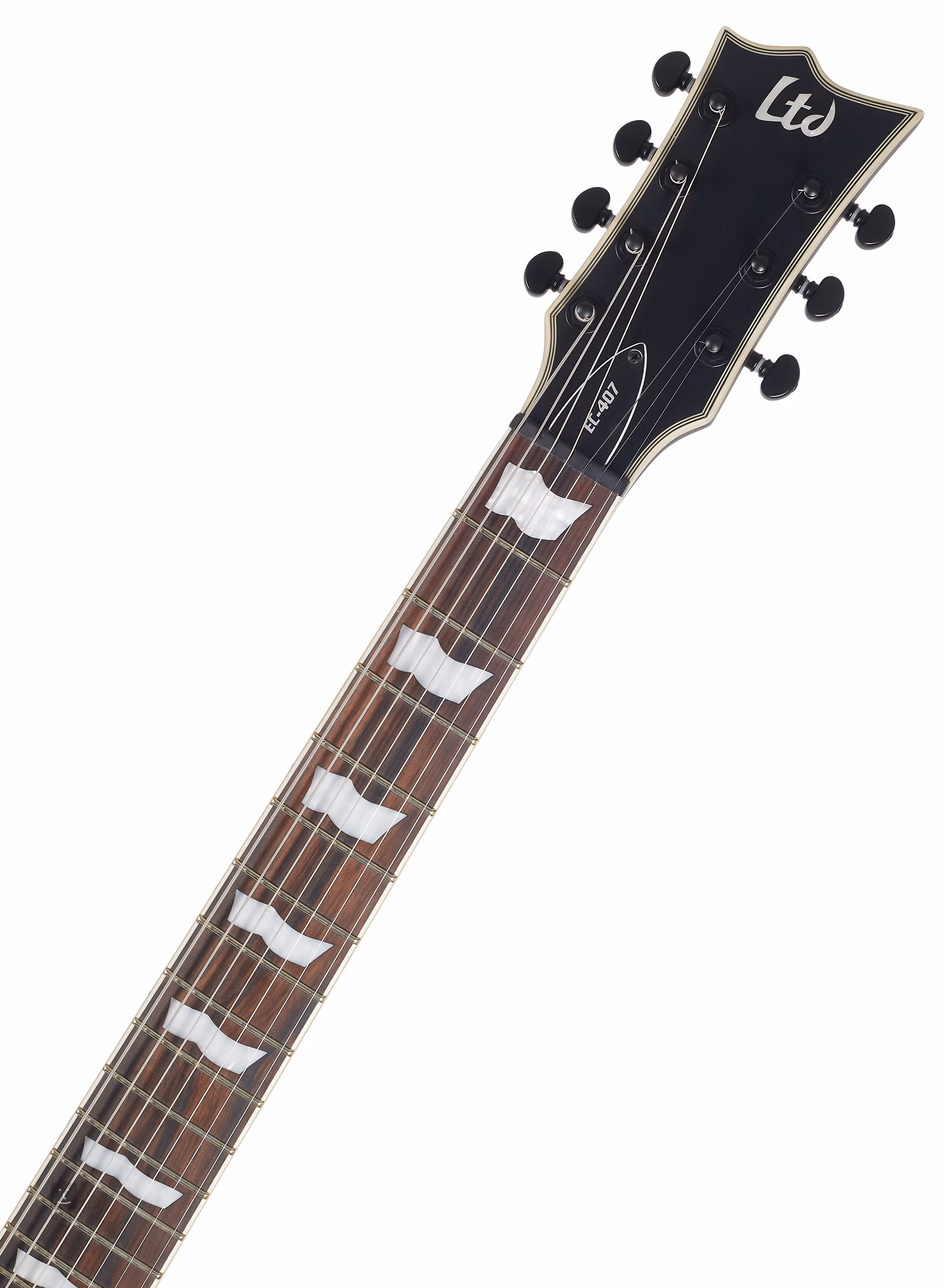 Mahagonové tělo sedmistrunné kytary ESP LTD EC-407 v single-cut designu kryje javorový top. Ke krku ze tří kusů javoru s konstrukcí set-thru, tj. krkem zapuštěným hlouběji do těla, je přilepen hmatník z ebenu makassar osazený čtyřiadvaceti pražci velikosti Extra Jumbo. Orientaci na hmatníku usnadňují polohové bloky v ESP designu.