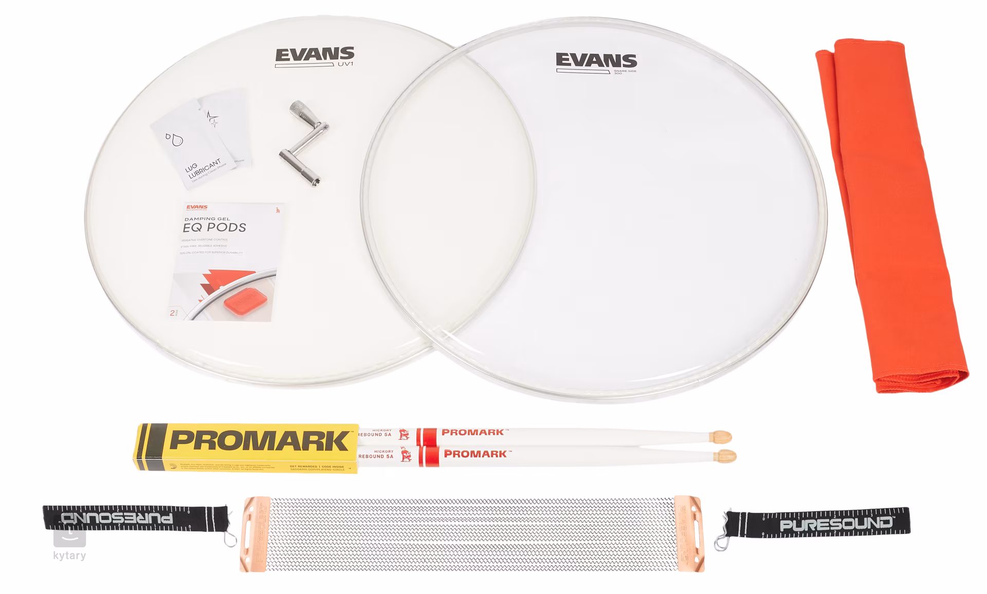 Evans 13‘‘ Snare Tune Up Kit UV1 je sada, která ze snare drumu udělá precizní pýchu vaší bicí sady. Obsahuje vše co potřebujete k modifikaci, nastavení a celkové údržbě – včetně návodu na vnitřní straně krabice. V balení najdete legendární 13‘‘ UV1 v kombinaci s Snareside 300 a struníkem PureSound 20 Strand Custom Pro Steel, balení tlumítek na blány a činely EQPODS a oblíbené paličky Special Edition Barney Beats ProMark Rebound 5A. Dále také krabičku obsahující nástroje pro údržbu: leštidlo, gel, leštící hadřík z mikrovláken a ladící klíč.