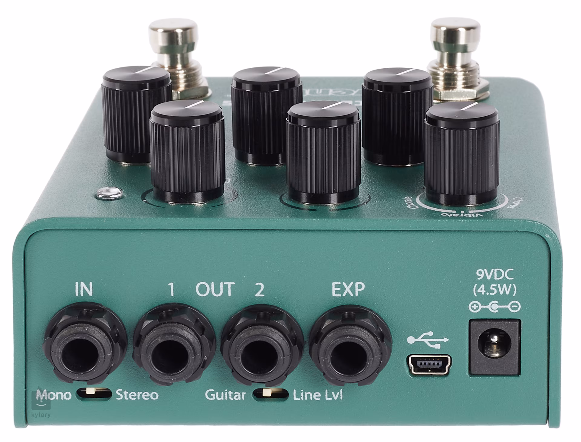 Zadní panel nabízí kromě konektorů i dva přepínače (Mono/Stereo vstup, Guitar/Line Lvl). V rámci zapojení lze volit z režimů Buffered, Relay, DSP+FX a Kill dry. K napájení efektu je zapotřebí 9V DC center negative adaptér.