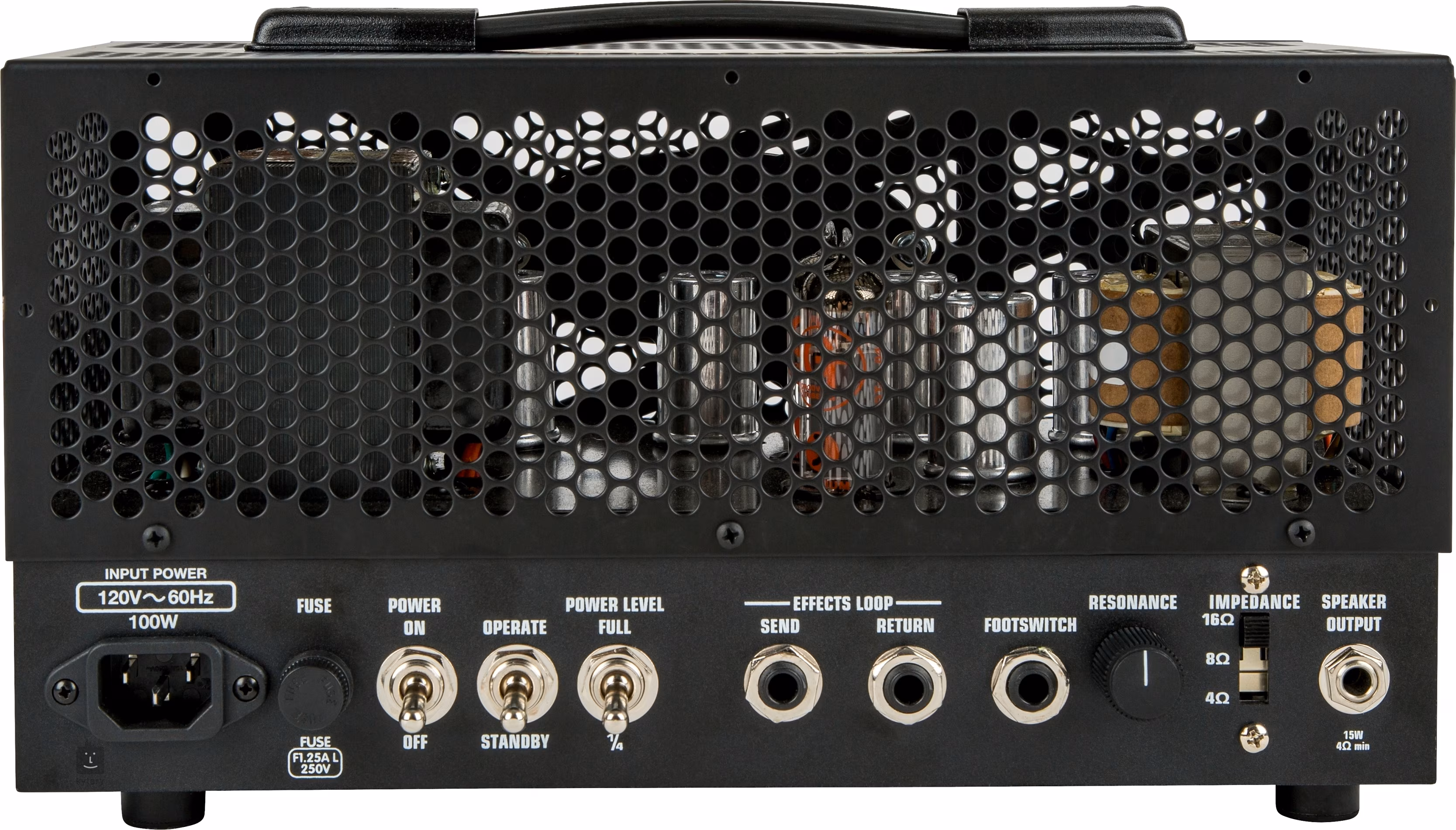 Pět elektronek ECC83S (12AX7) v preampu a dvě koncové elektronky EL84 spolehlivě poskytují tomuto aparátu řádně šťavnatý high-gain zvuk. Dva kanály, modrý “Crunch” a červený “Full Burn” nabízí v kombinaci s nastavením ovladačů (low/mid/high/presence/resonance) všechny odstíny “brown soundu” - od žhavých tónů jižanského blues po nekompromisní metalové zkreslení. K dispozici je i efektová smyčka pro snadné připojení vašich oblíbených pedálových efektů, výstup do reproboxu (přepínačem lze nastavit impedanci 16, 8 nebo 4 ohmy) a přibalený footswitch pro snadné přepínání mezi kanály.