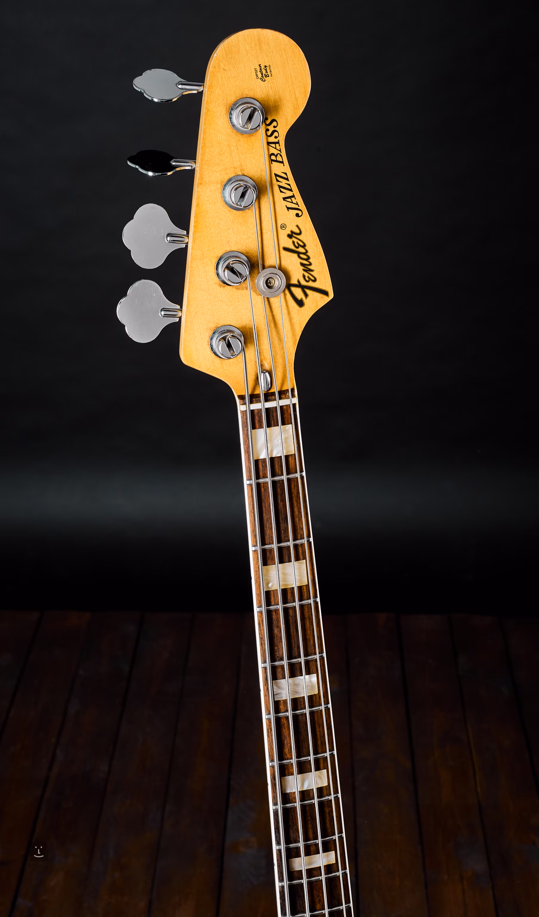 Jazz Bass z roku 1976 s jasanovým tělem a palisandrovým hmatníkem. Jeden z posledních nástrojů s velkým TV logem.