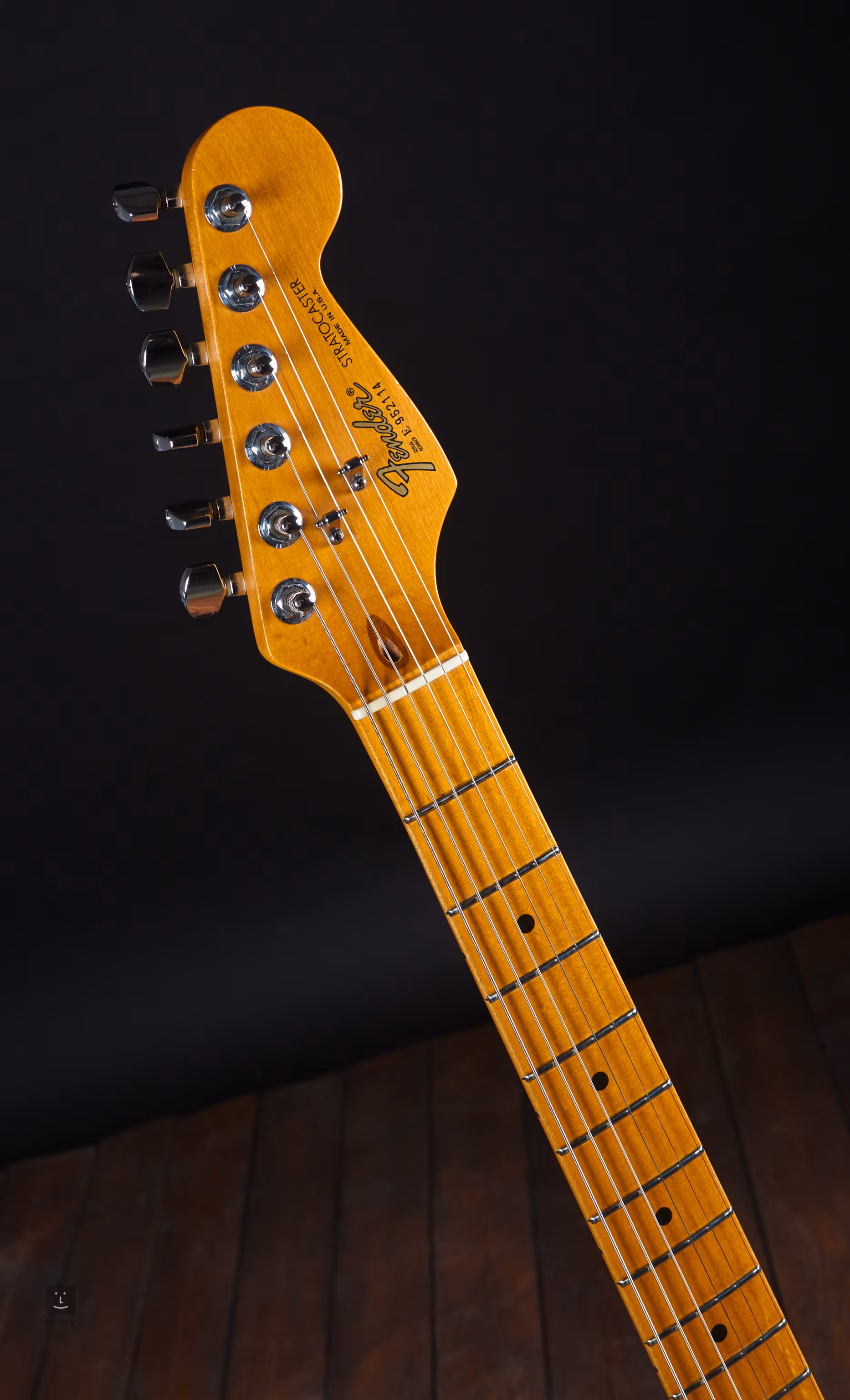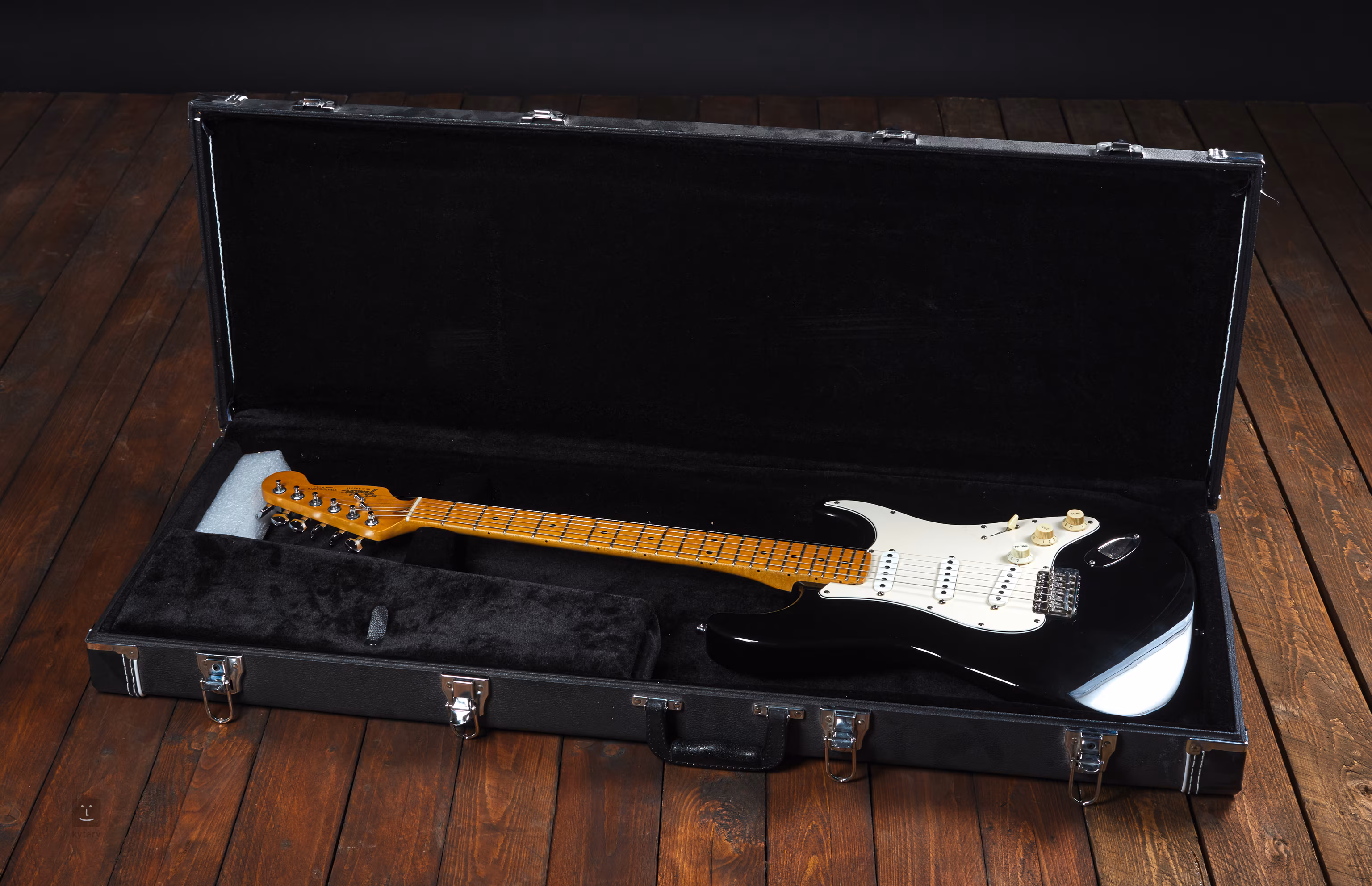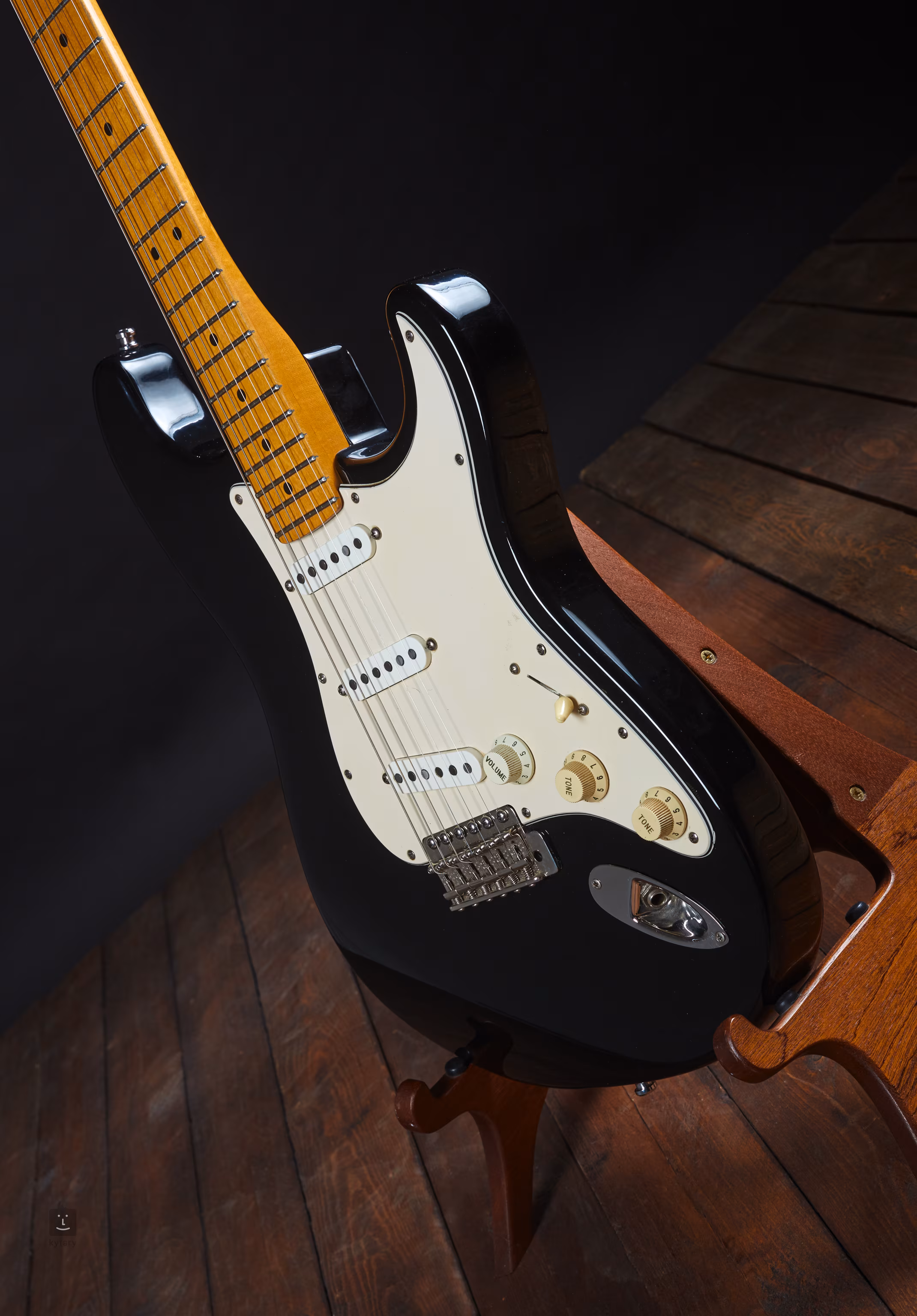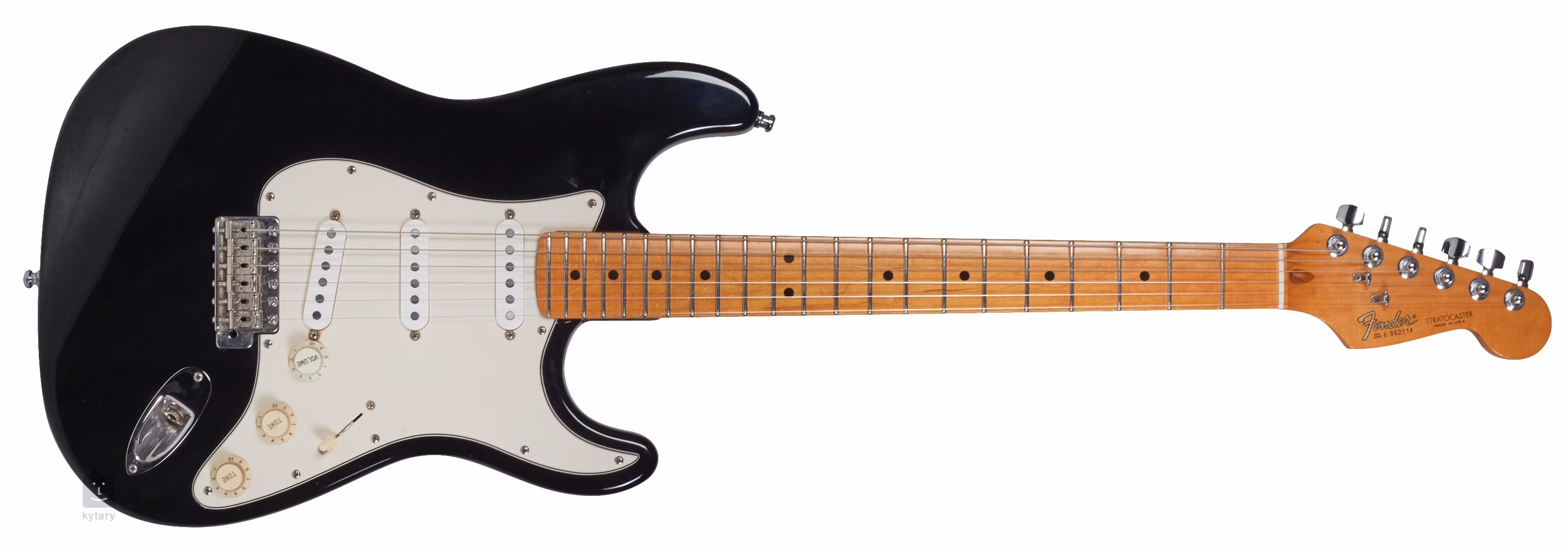Černý stratocaster je z roku 1989. V typické barevné kombinaci s bílým pickguardem a javorovým hmatníkem nabízí zvuk, jaký od stratu očekáváte.