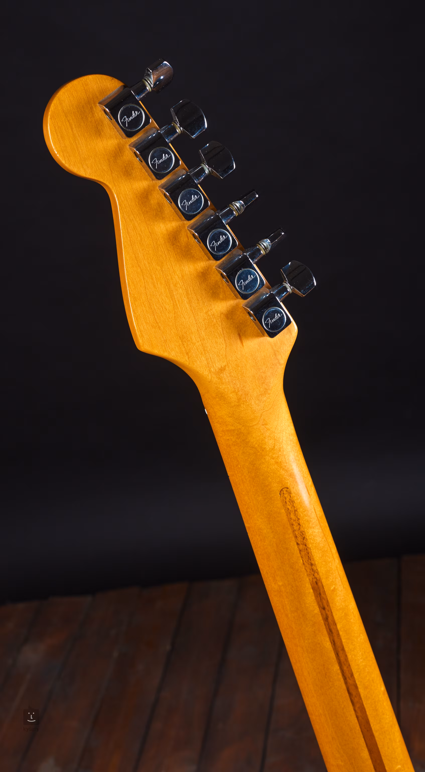 Na nástroji je nainstalované Callaham tremolo typu vintage - původní kotvení na 2 velké šrouby je zaretušované černým lakem. knob Volume je novější. Hmatník je přepražcován.
