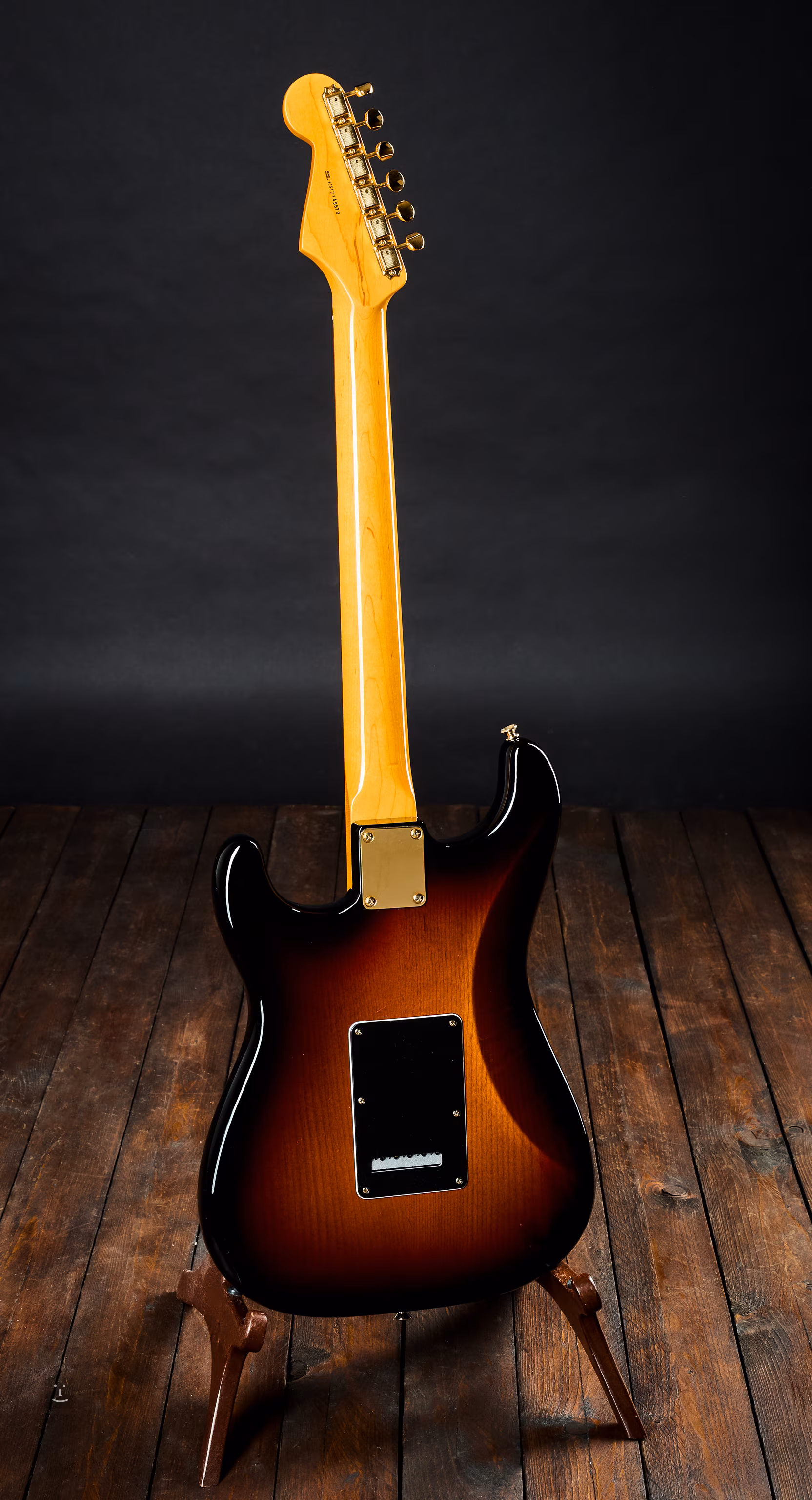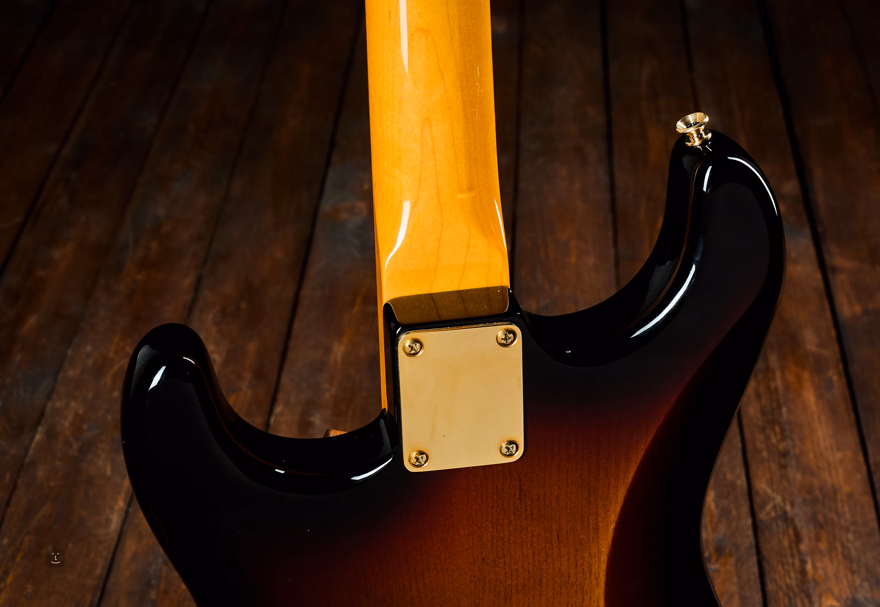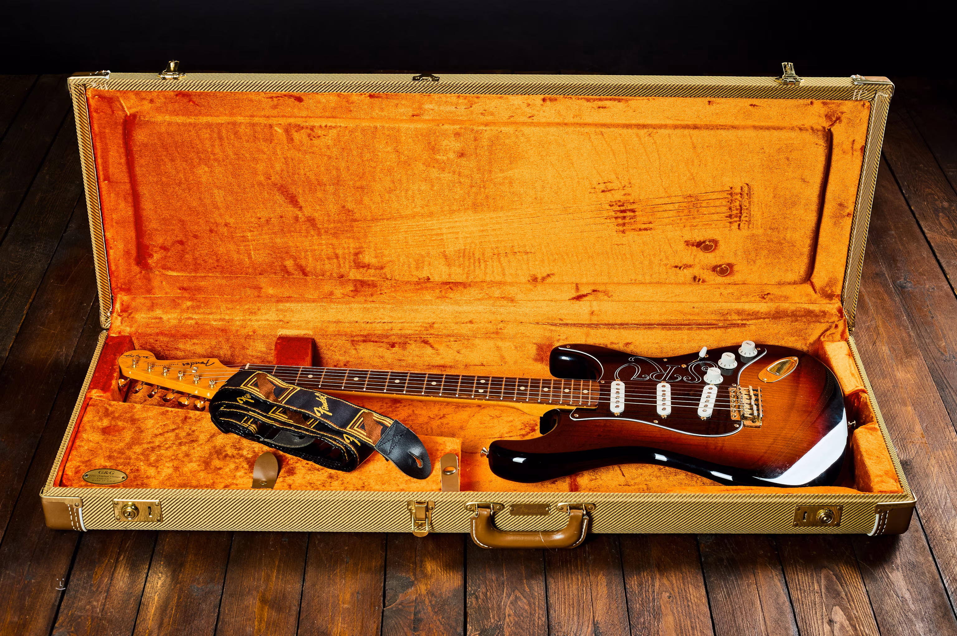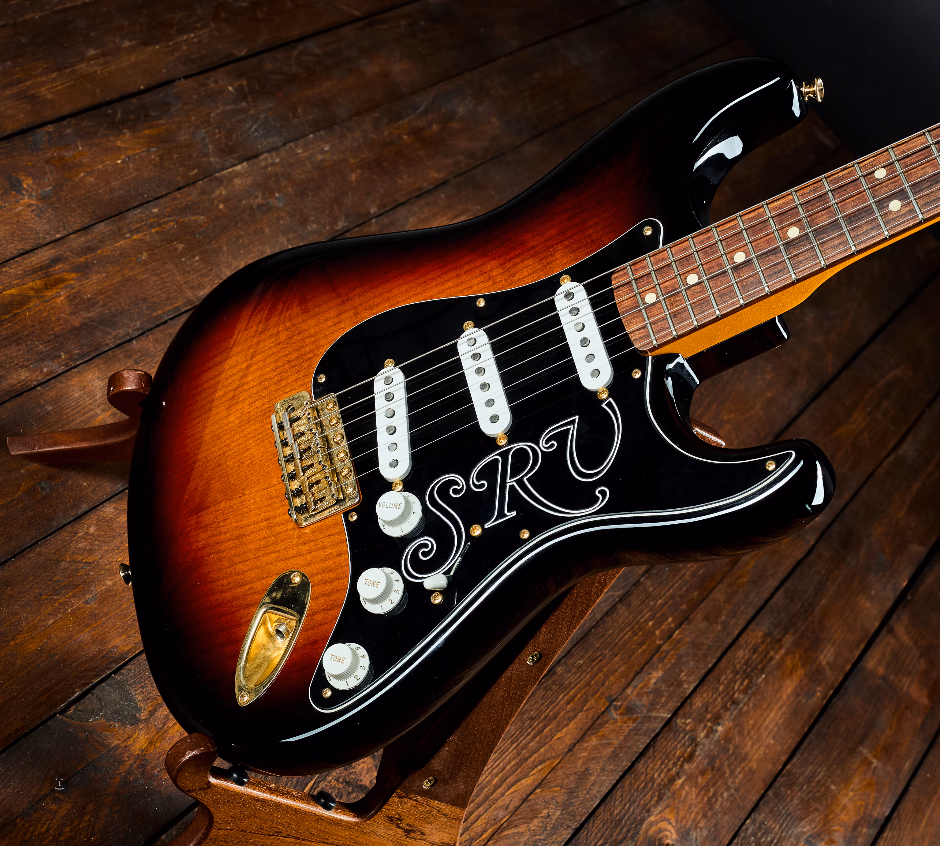 Podpisová kytara SRV je klasikou mezi signature nástroji Fender. Specifická je obrácenou kobylkou, kdy je páka tremola umístitelná na horní straně, nabroušenými snímači Texas Special, zlatým hardwarem a pickguardem s iniciály kytarové legendy.