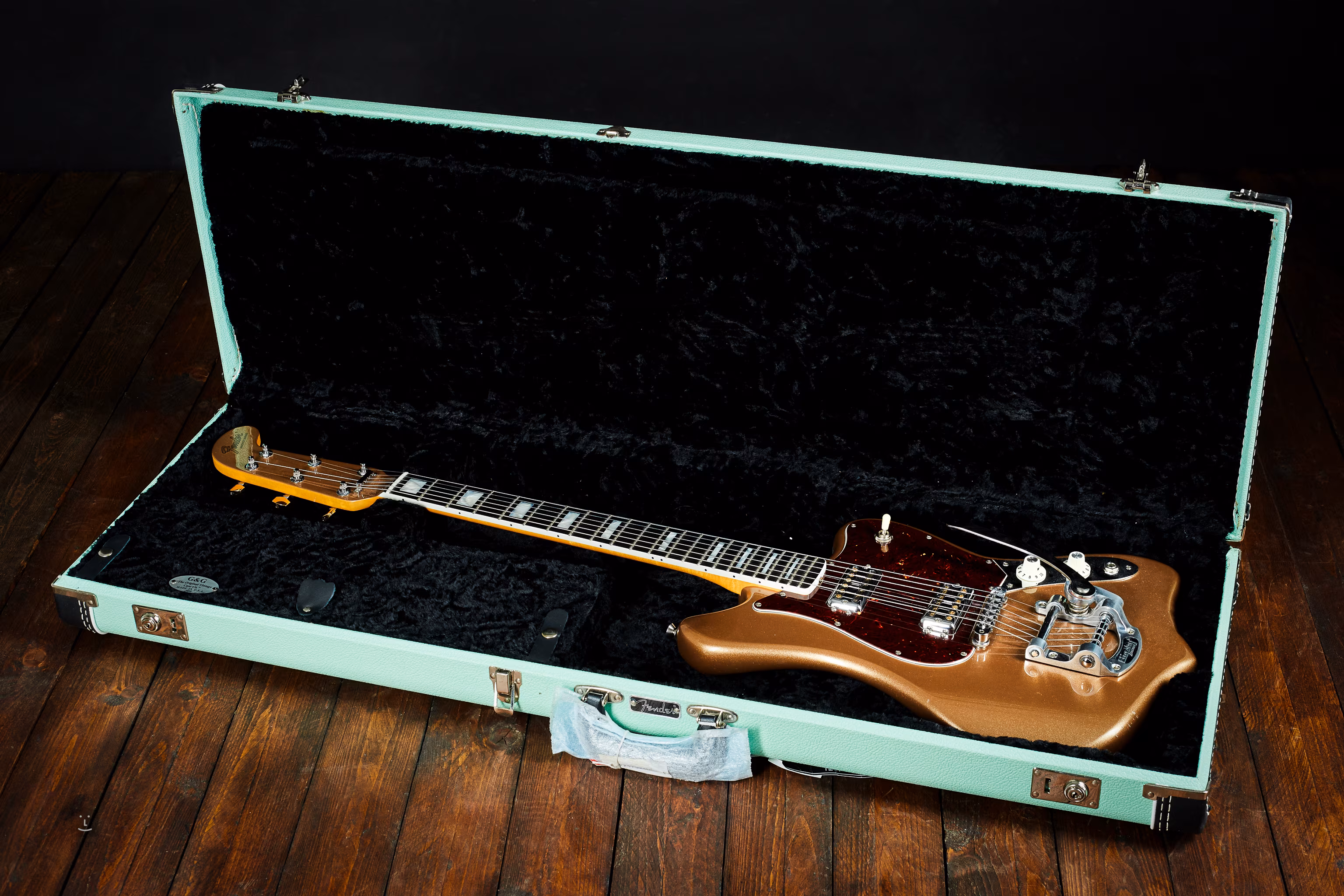 Kytara má 2 malé zásahy - na hlavici jsou nepůvodní chromovo-zlaté ladicí mechaniky, pod kterými jsou na straně vidět otvory po předchozích mechanikách; na vrchním rohu těla zepředu je zaretušovaný ťukanec v laku. Jinak je nástroj (teprve z roku 2020) ve skvělém stavu, prodává s původním v atraktivním zeleným (Sea Foam Green) kufrem.