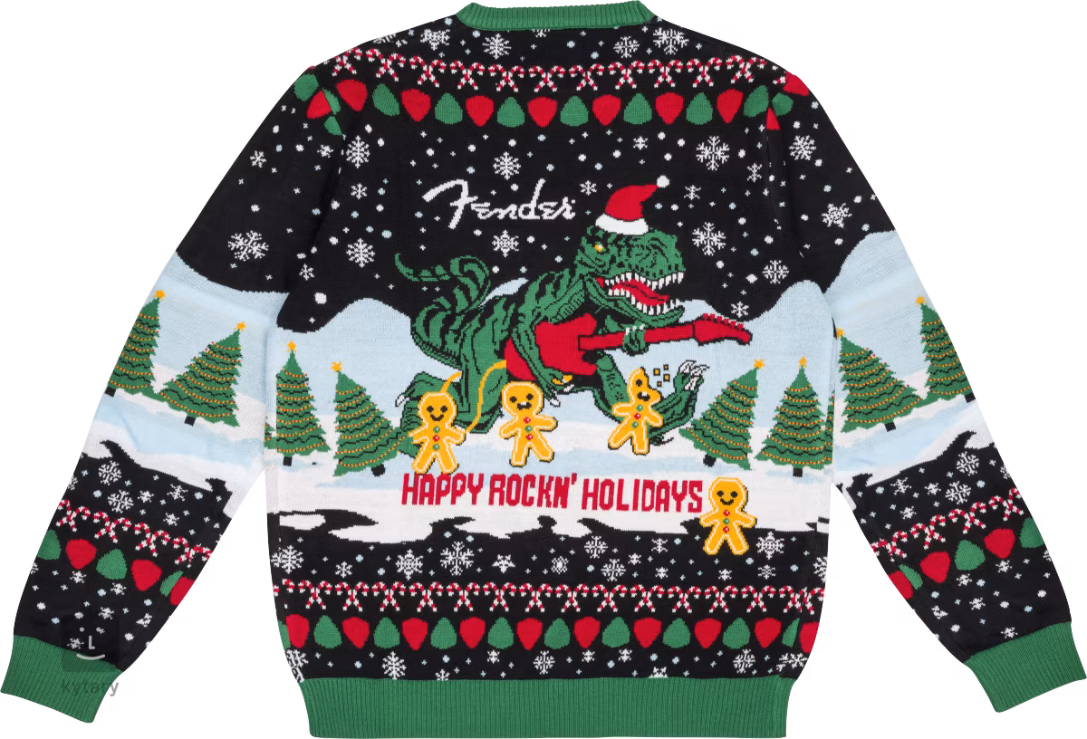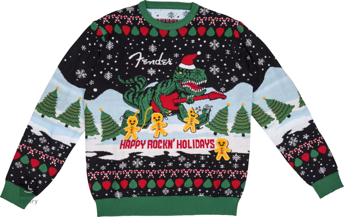 Fender 2023 “Telerex” Ugly Christmas Sweater je svetr pod vánočním stromečkem, který rockeři a rockerky, starší i mladší, přijmou s úsměvem na rtech. Svetr je zhotoven z umělých vláken (akryl) a zdobí jej pletené vzory s vánoční tematikou a dinosaurem T-Rex s červeným Telecasterem. Zdá se vám to švihlé? O důvod víc svetr vlastnit. K dispozici je ve velikostech S - XXL.