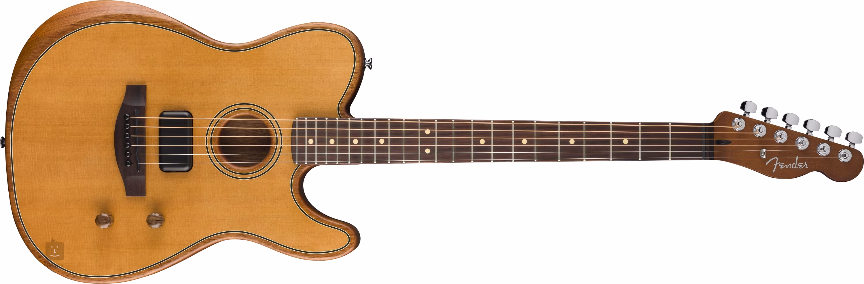 Fender Acoustasonic Standard Telecaster ANA už na první pohled upoutá parádním designem a herními vlastnostmi odvozenými od elektrických kytar typu Telecaster i akustických nástrojů. Úzké komorované tělo ze dřeva nyatoh a přední deska z masivu smrku Sitka nabízí přirozenou hlasitost a rezonanci akustických kytar. Kytara tak bude dobře hrát i „unplugged“ ve vašem obýváku, nicméně její skutečné přednosti kytary přináší až amplifikace. Herní pohodlí i při delším posezení u kytary zaručuje opěrka ramene.