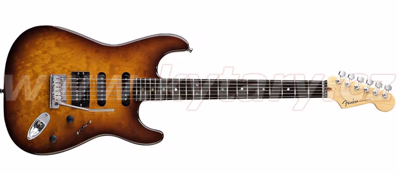 Elektrická kytara typu Stratocaster ze série American Deluxe, tělo výběrová olše + top z obláčkového javoru, krk javor, šroubovaný, konfigurace snímačů HB – SC – SC (DH-1 + 2x SaCo Noiseless), 22 pražců, barva Amber