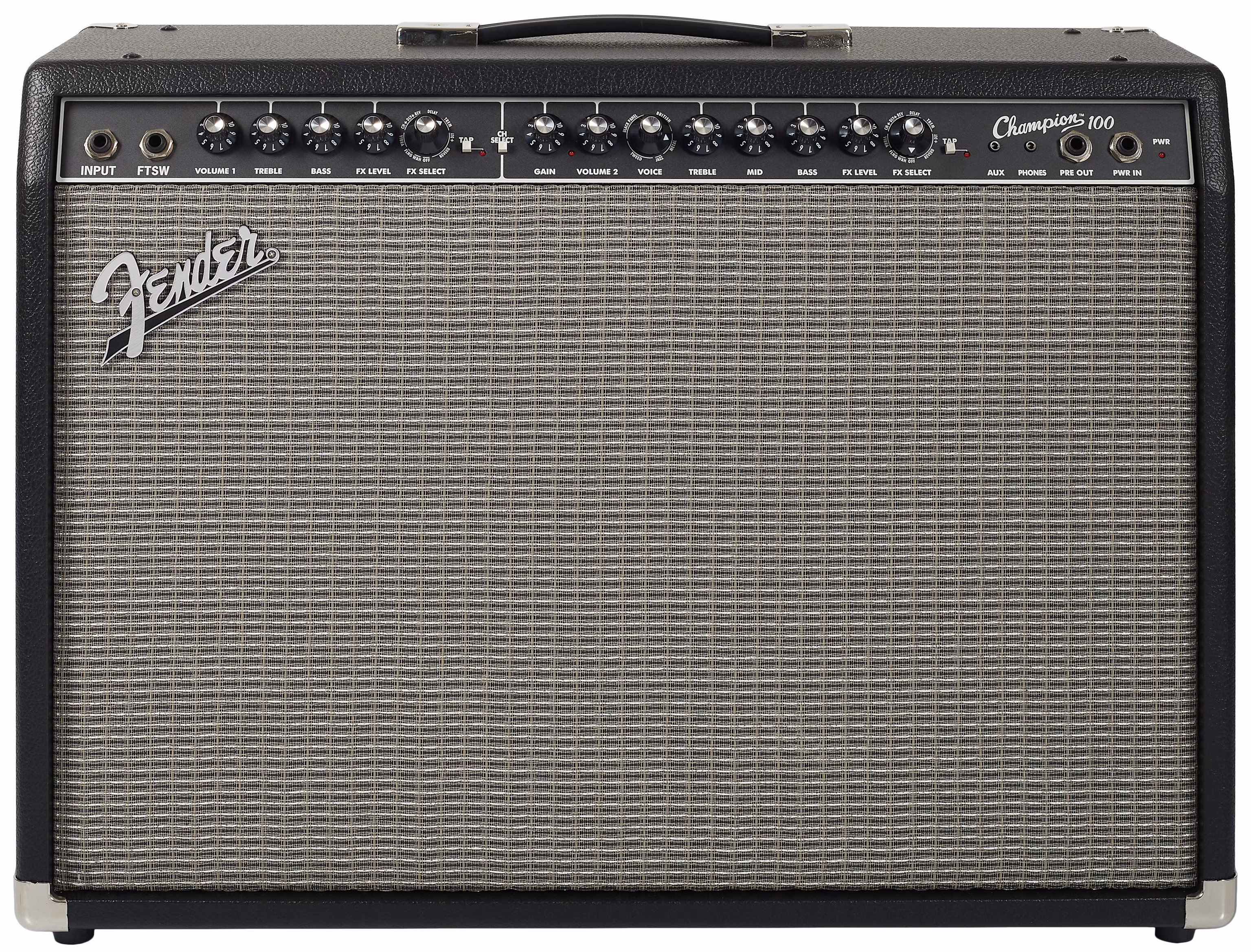 Champion 100 je pak 100wattové kombo osazené dvěma 12palcovými reproduktory Special Design. Umožňuje pracovat s dvěma kanály, první kanál vychází z čistého zvuku Blackface Fenderů, zvuk druhého kanálu závisí na zvoleném Amp Voice nastavení. Jde o model vhodný pro i hraní ve zkušebně a na koncertních podiích.
