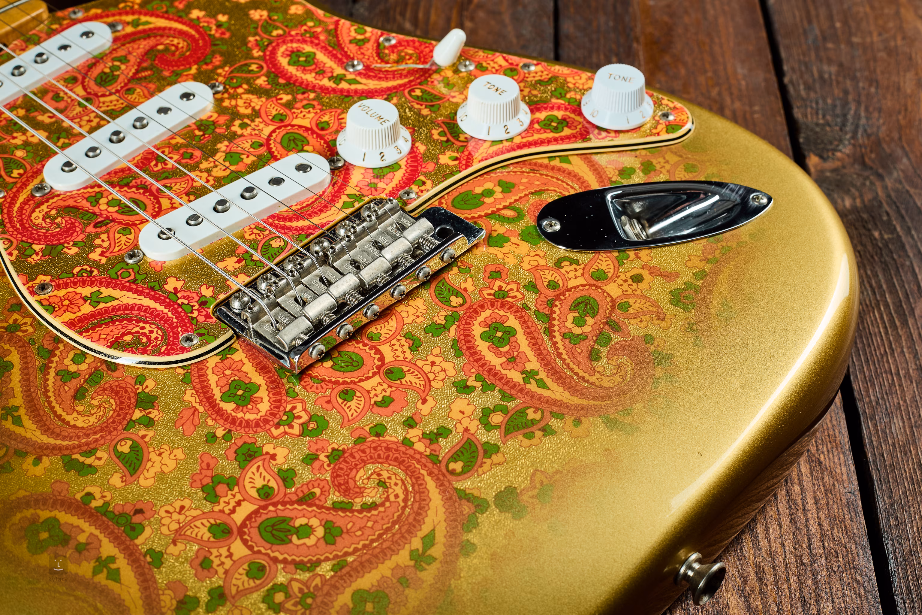 Nástroj má několik drobnějších, pouze kosmetických stop po předchozím používání: na vrchní straně těla; u spoje krku; kolem zadního krytu tremola a na konci hlavice. Prodává se včetně originálního kufru, kde nejdete veškeré oniginální příslušenství (certifikáty, páku, katalog, pružiny, kryt kobylky, kožený popruh Fender Custom Shop).