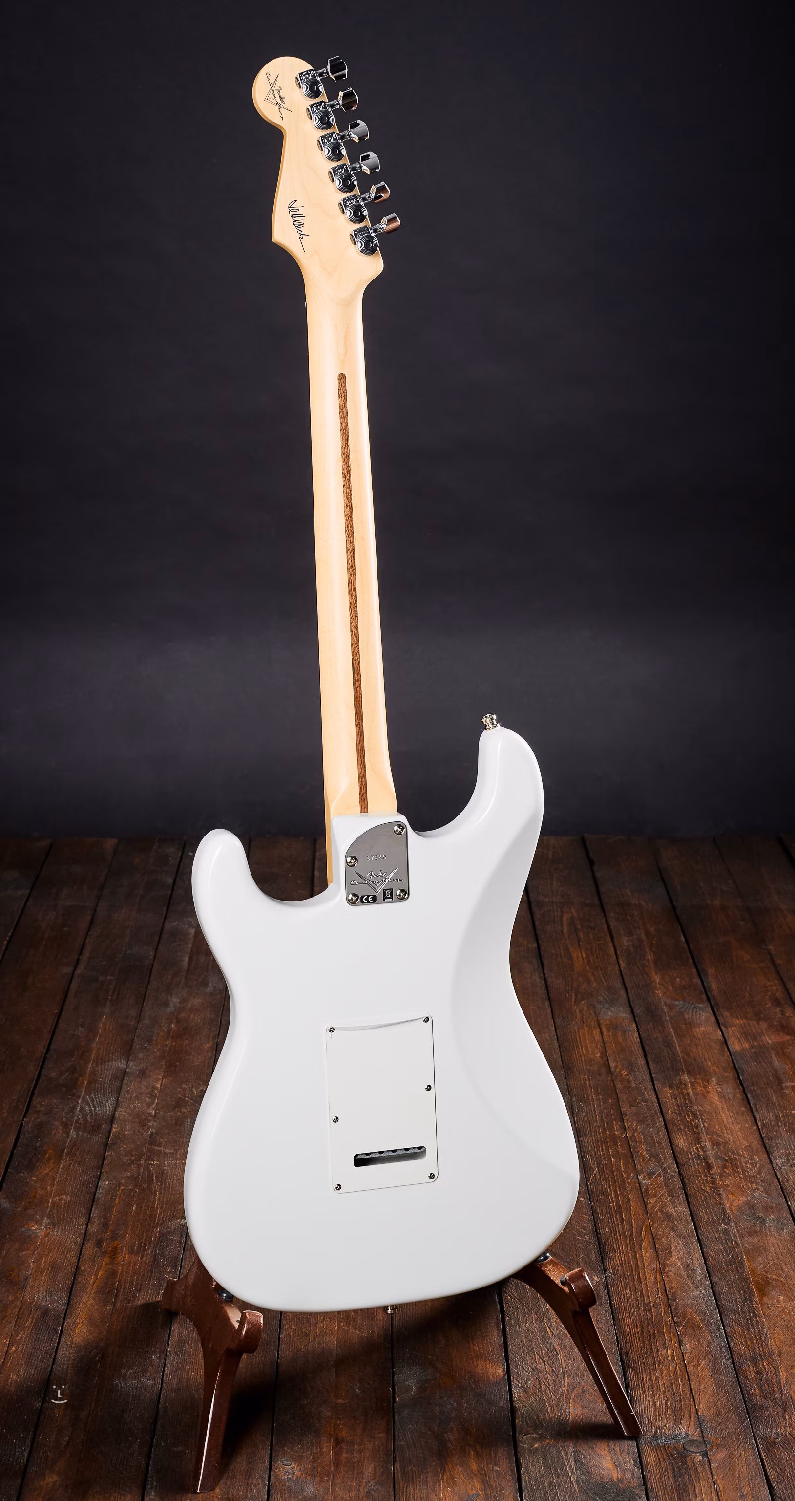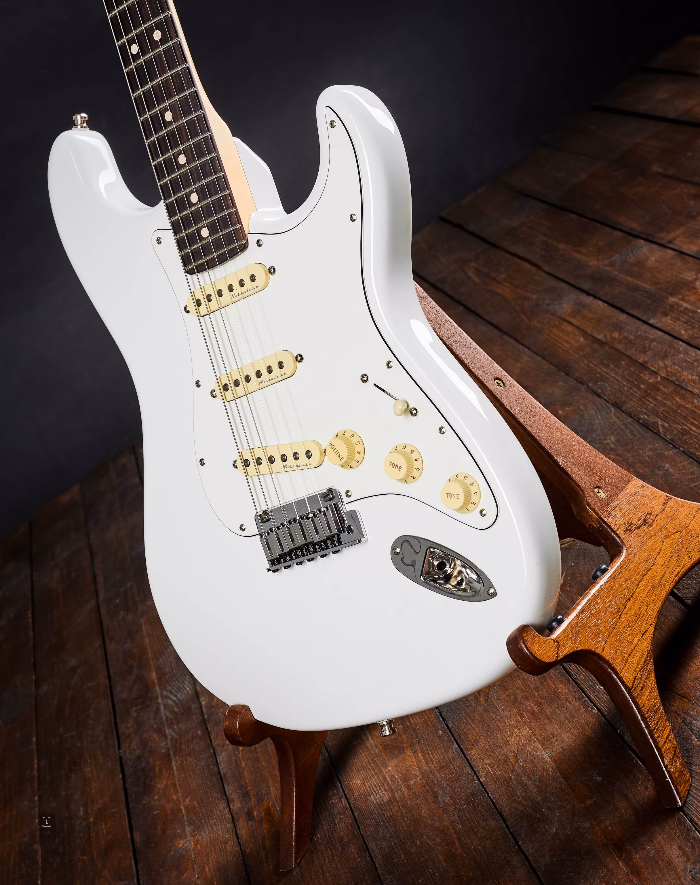 Jeff Beck Signature Stratocaster RW Olympic White je signature model slavného anglického kytaristy, který ovlivnil několik generací muzikantů. Olšové tělo kytary zdobí povrchová úprava NOS. K užšímu javorovému krku s pohodlným Thin “C” profilem je přilepený palisandrový hmatník osazený dvaadvaceti pražci velikosti Medium Jumbo.Tvarovaná patka krku usnadňuje dohmat na vyšších polohách hmatníku.