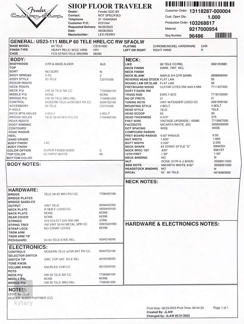 Kytara je dodávána v kufru spolu s certifikátem pravosti.