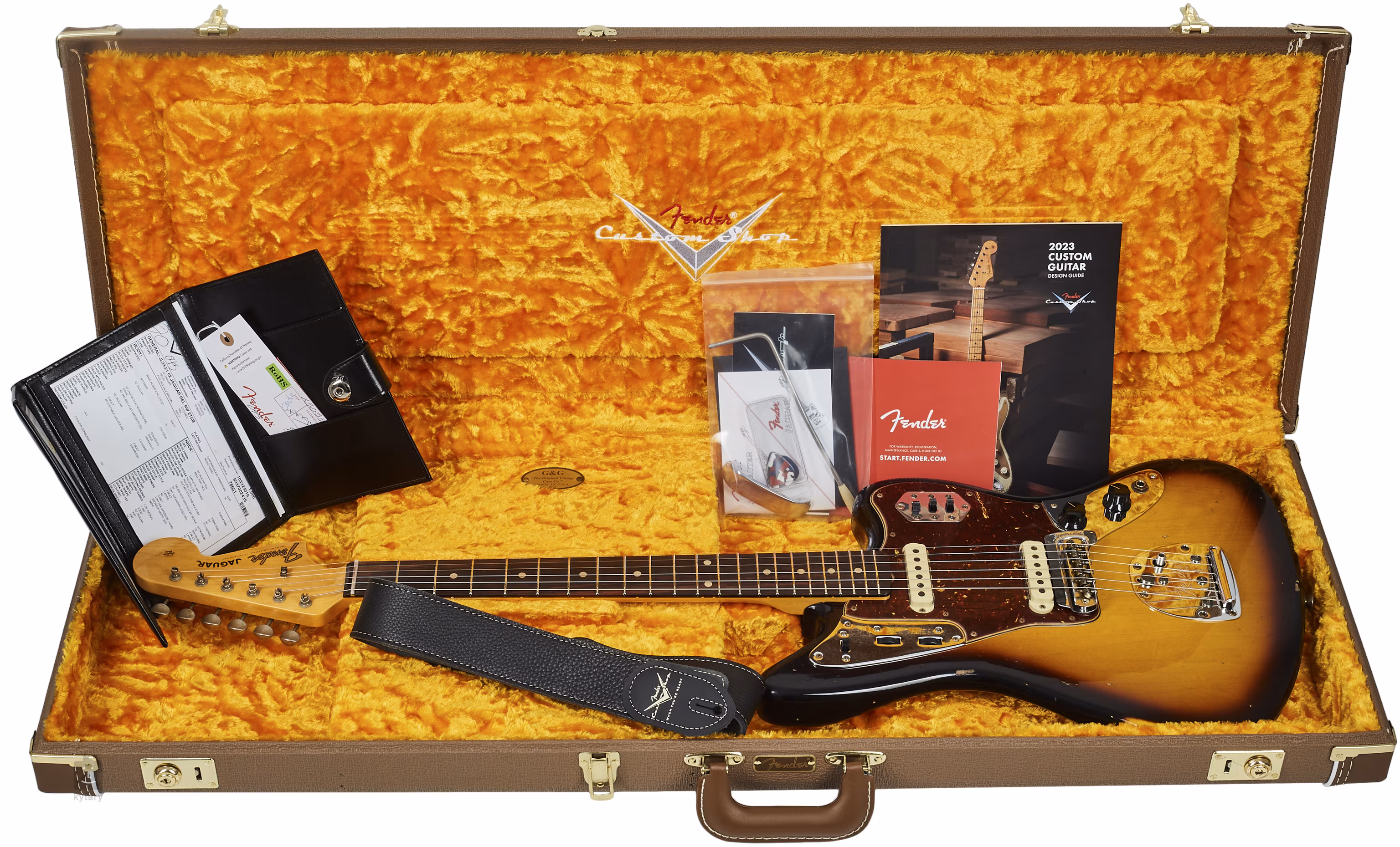 Kytara je dodávána v kufru spolu s popruhem a certifikátem pravosti.