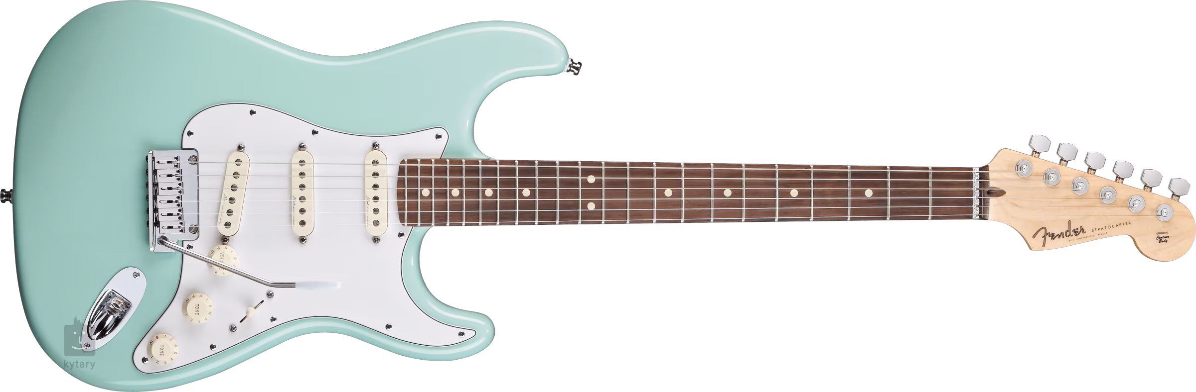 Jeff Beck Signature Stratocaster NOS Surf Green je signature model slavného anglického kytaristy, který ovlivnil několik generací muzikantů. Olšové tělo kytary zdobí povrchová úprava NOS (New Old Stock), což je zcela autentický finiš originálů z 50. a 60. let bez prvků umělé patiny a projevů stárnutí v podobě vybledlého laku. K užšímu javorovému krku s pohodlným Thin “C” profilem je přilepen palisandrový hmatník osazený dvaadvaceti pražci velikosti Medium Jumbo. Tvarovaná patka krku usnadňuje dohmat na vyšších polohách hmatníku.